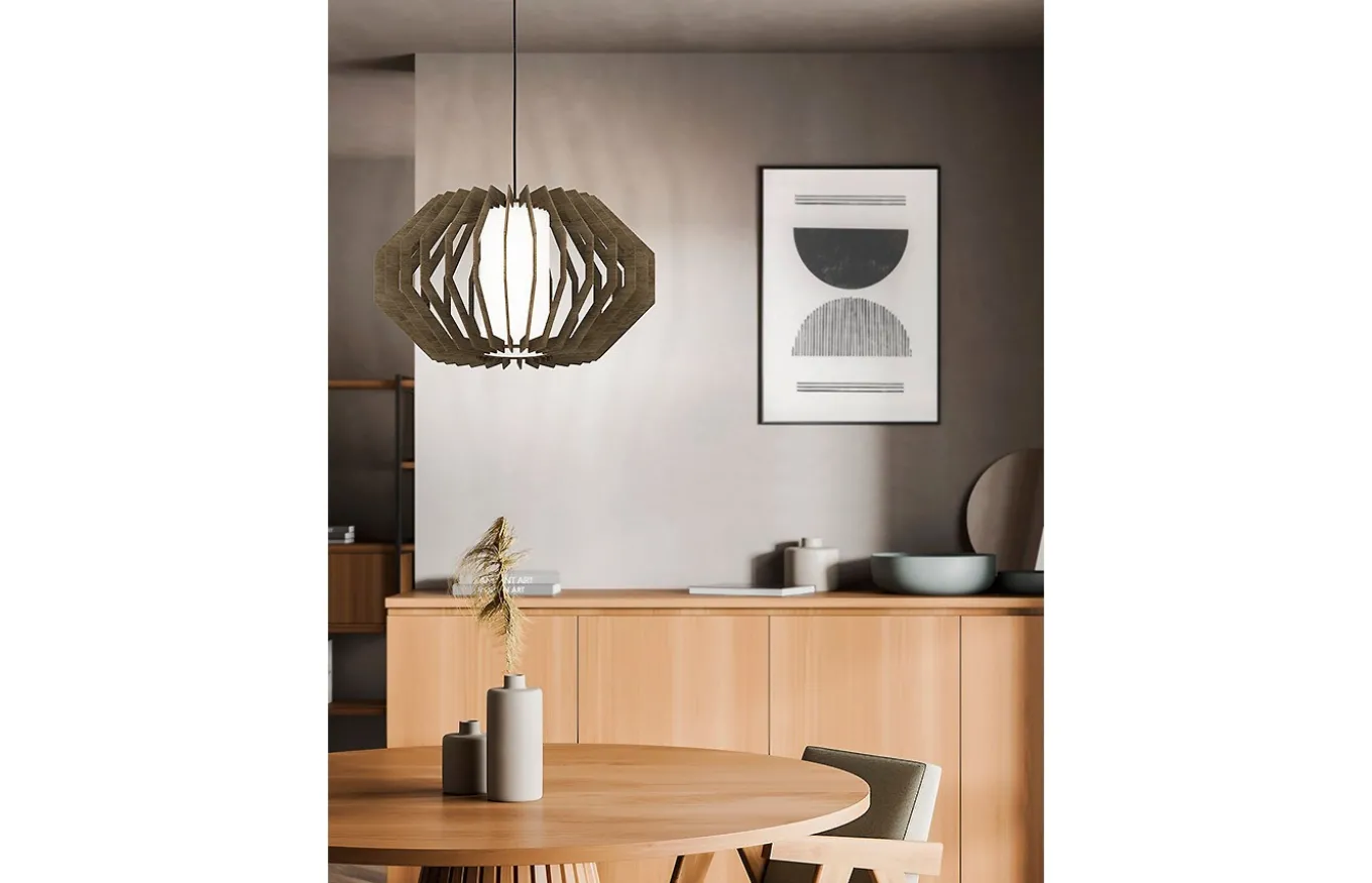 La lámpara colgante Rusticaria tiene una pantalla fabricada con listones de madera de color marrón, y está suspendida de un dosel metálico del mismo color con un cable textil negro. El cilindro interno de vidrio blanco completa el aspecto moderno de la lámpara y garantiza una iluminación agradable.