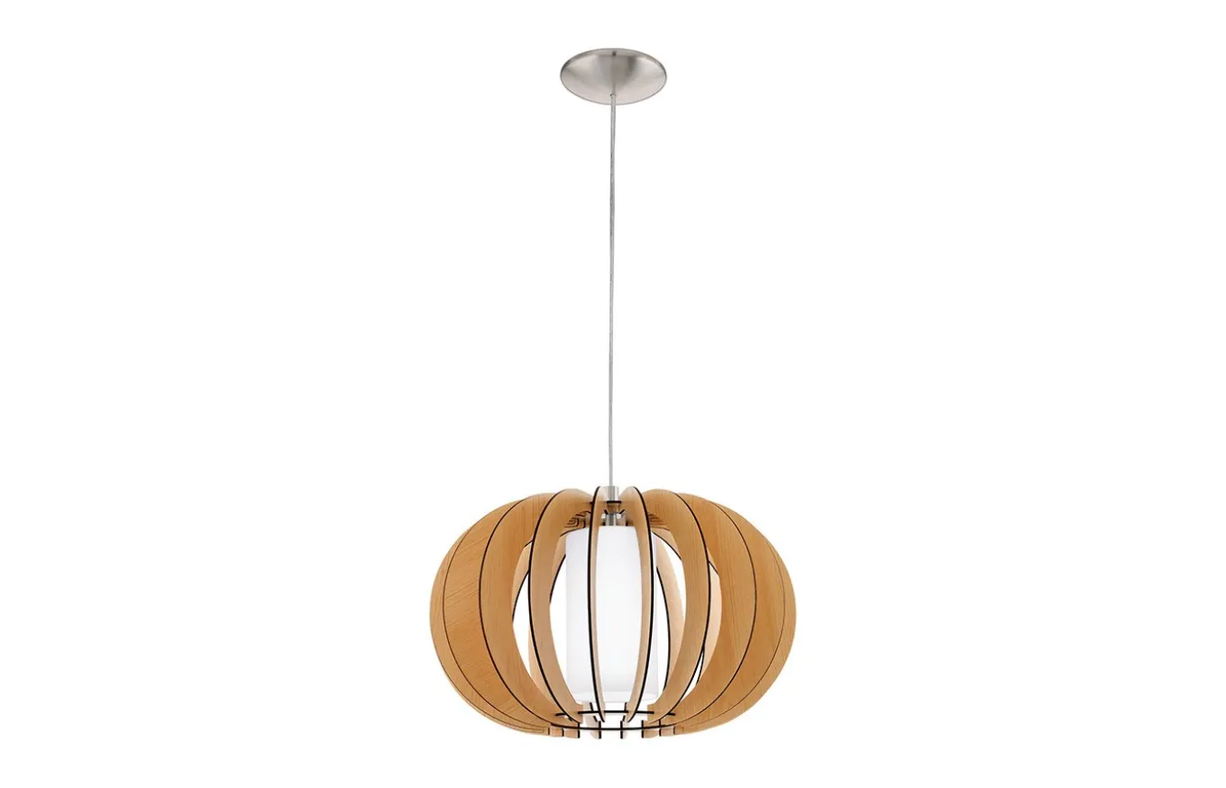 La lámpara colgante Stellato está fabricada con una pantalla redonda de tiras de madera marrón suspendida de un dosel níquel mate. El cilindro interno de vidrio blanco completa el aspecto moderno de la lámpara y garantiza una iluminación agradable. Esta lámpara colgante se adapta a la perfección a los estilos de decoración modernos y ofrece una iluminación hogareña en el salón o sobre la mesa del comedor.