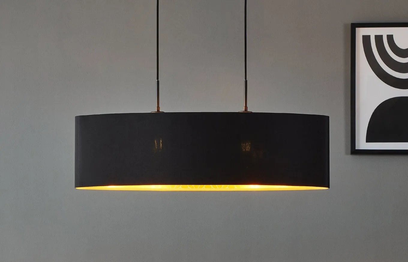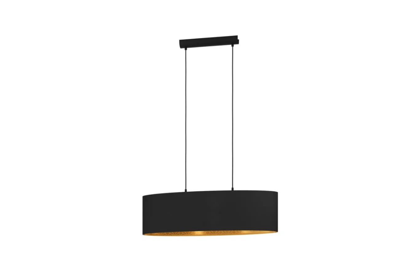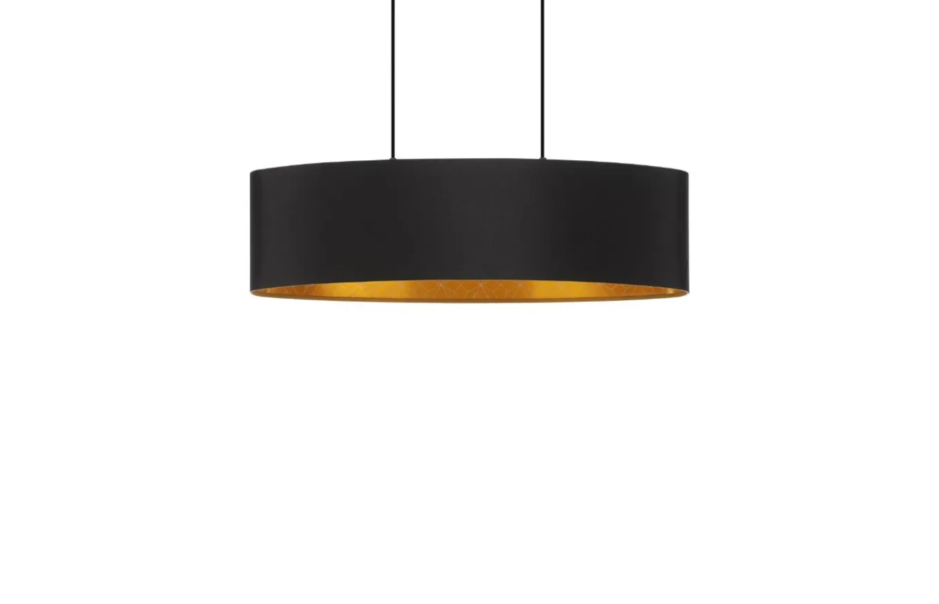 Lámpara colgante Zaragoza. La lámpara Zaragoza está compuesta por una pantalla textil ovalada en color negro con el interior en color dorado. El fino patrón geométrico/floral en el interior de la pantalla le da a la lámpara su aspecto especial.
