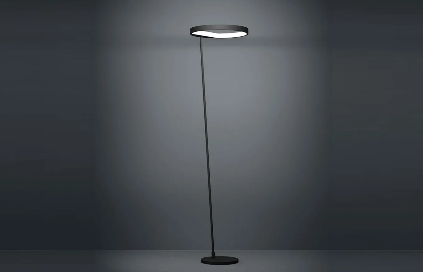 La lámpara de pie Caredara está fabricada con una pantalla de cristal ahumado de forma orgánica en color negro transparente (fumé). La pantalla está suspendida mediante un cable textil negro de un dosel de metal cromado.