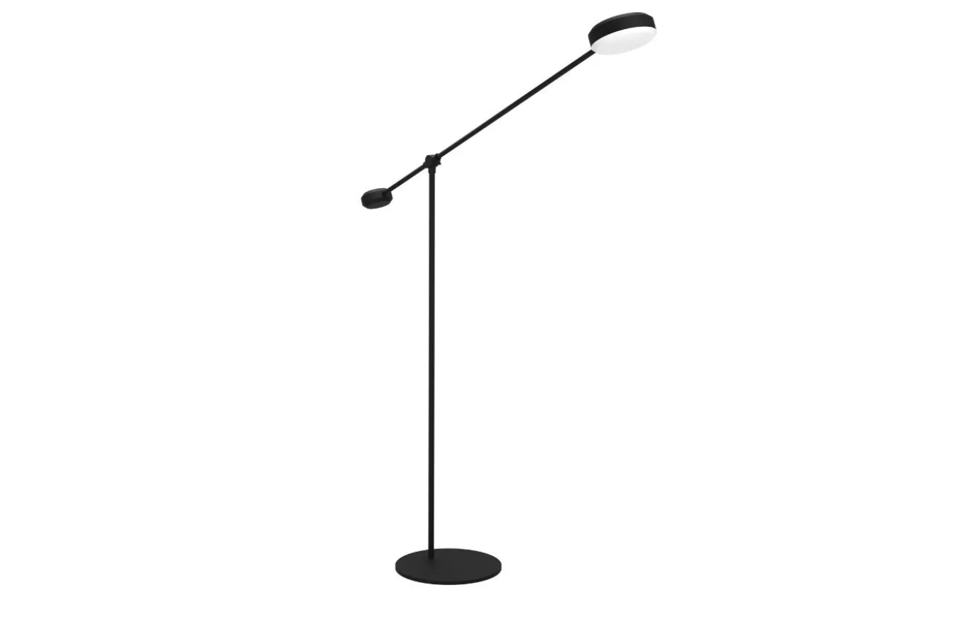 Lámpara de pie Clavellina está compuesta por una pantalla circular fabricada en acero de color negro y una pantalla de plástico en color blanco que proyecta luz LED con intensidad regulable para adecuarla al momento.