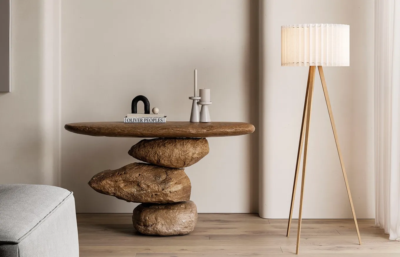 La pantalla cilíndrica de lino plisado ofrece una luz difusa y suave, ideal para crear un ambiente relajante. El trípode de metal imitación a pino aporta estabilidad y un toque de sofisticación, combinando a la perfección con diferentes estilos decorativos.