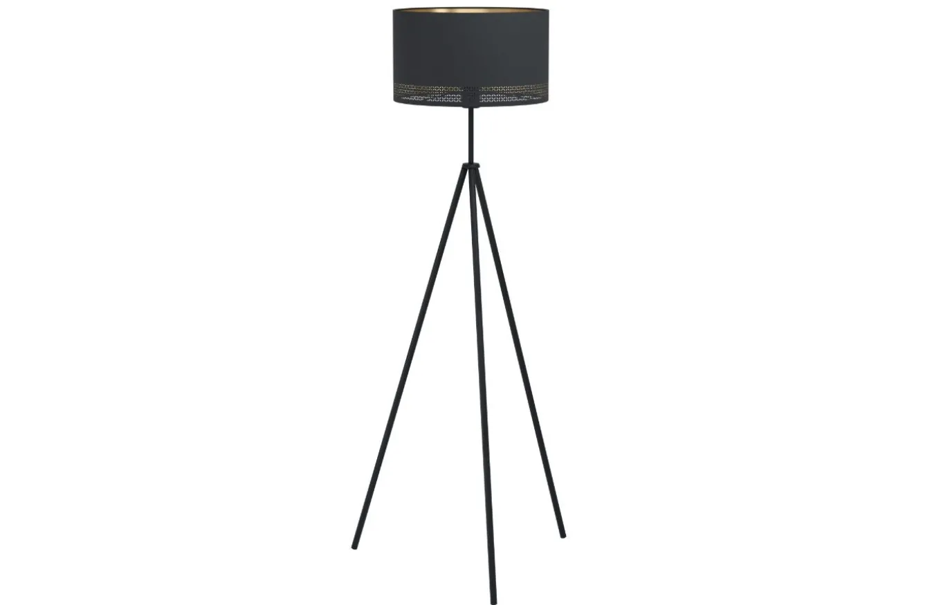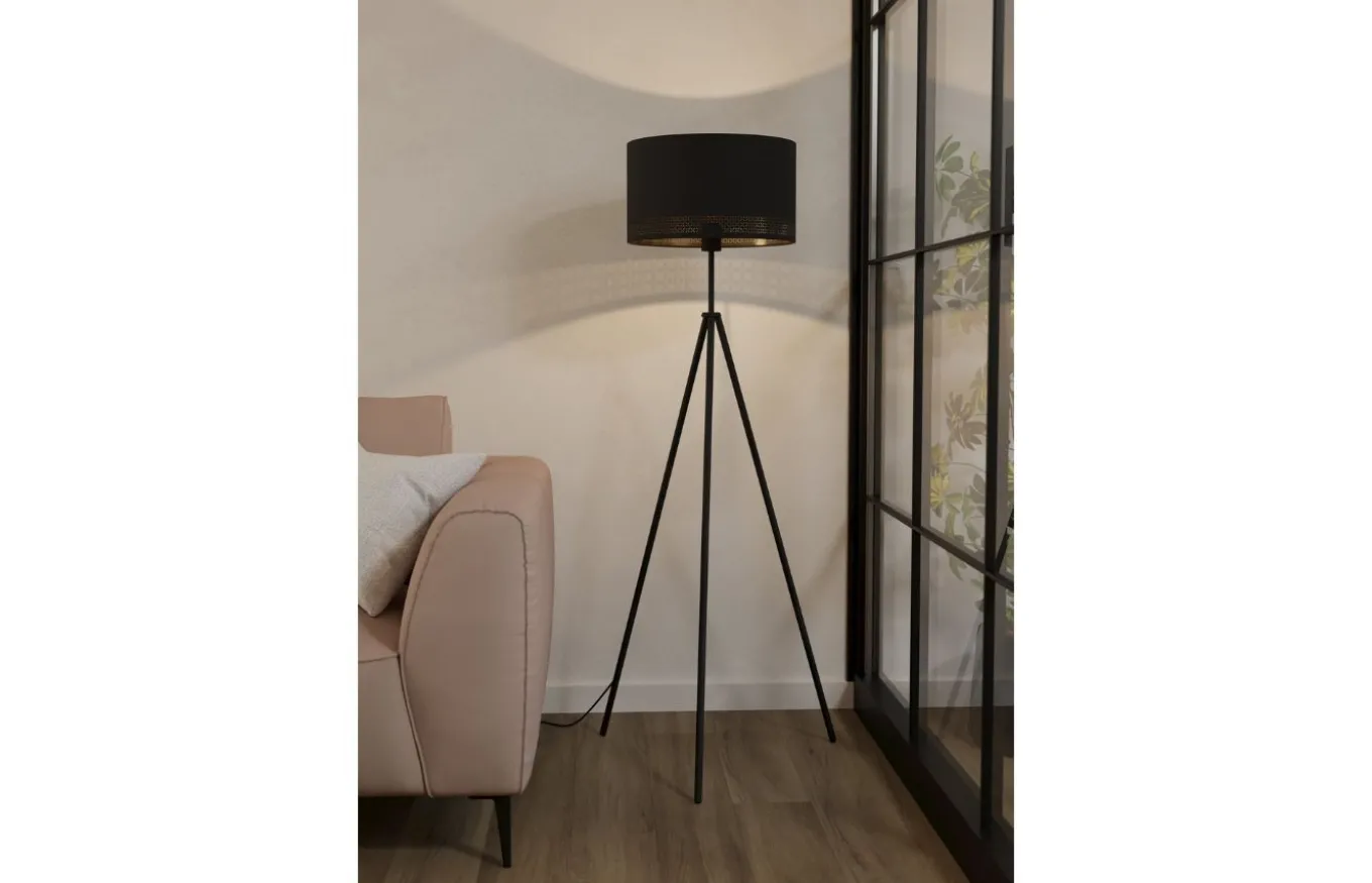 La lámpara de pie Esteperra tiene un pie de metal en color negro y una pantalla textil en color negro con un interior en color oro. En el borde de la pantalla, unos pequeños recortes crean fascinantes juegos de luces y sombras en cuanto se enciende la lámpara. También es posible encenderla y apagarla cómodamente usando un interruptor que se encuentra en el cable.