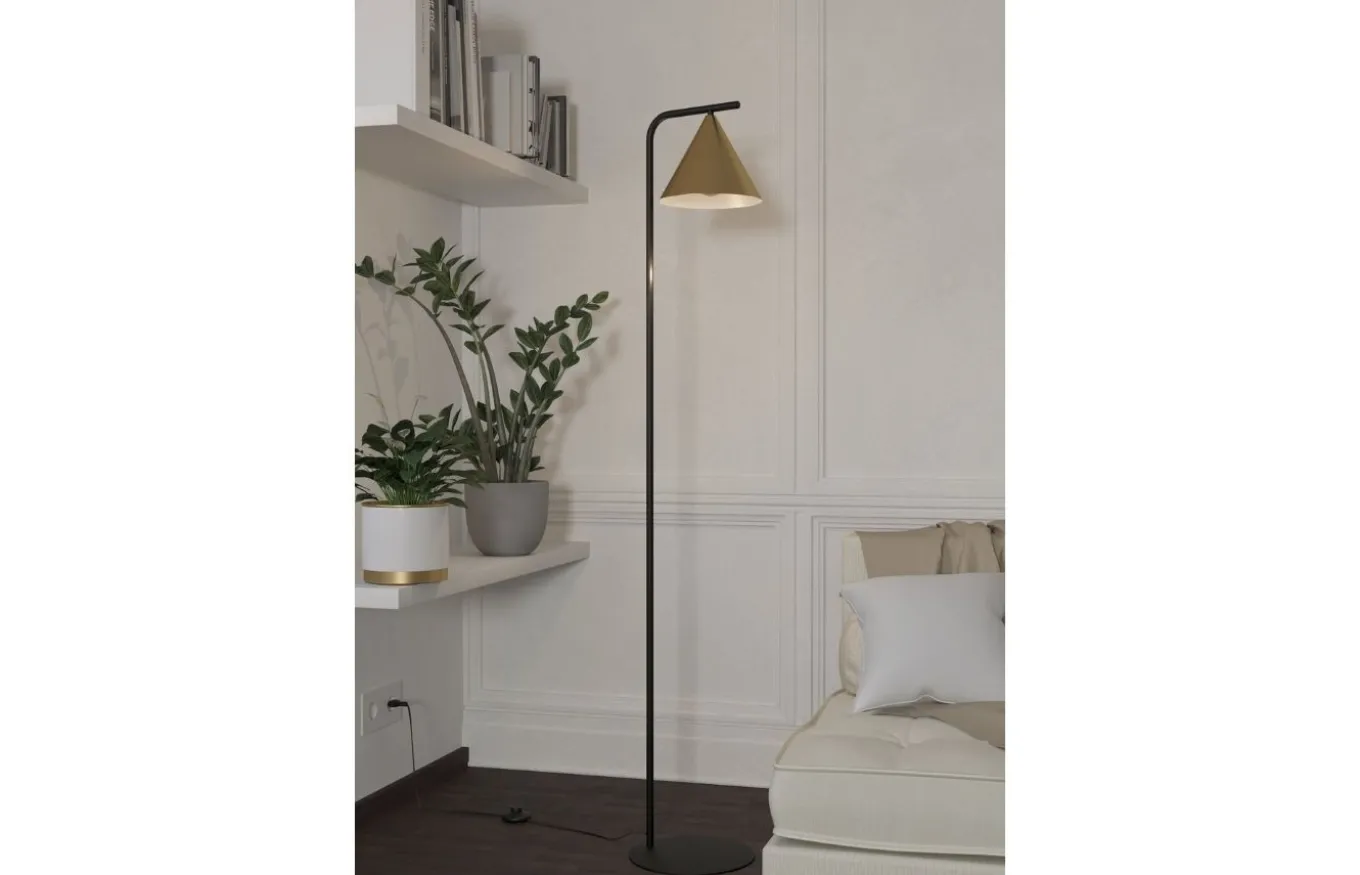 Lámpara de pie Narices, con su diseño lineal y puro, ofrece una iluminación elegante en el salón, el dormitorio o el comedor. Está formada por una base curvada de metal negro a la que se ha acoplado una pantalla cónica fabricada en latón cepillado. El interruptor se encuentra en el cable para encenderla y pagarla cómodamente.
