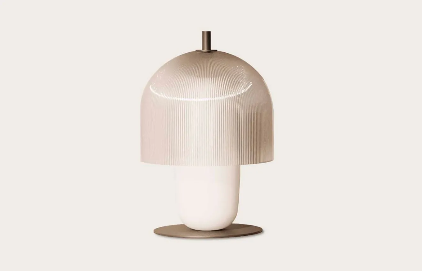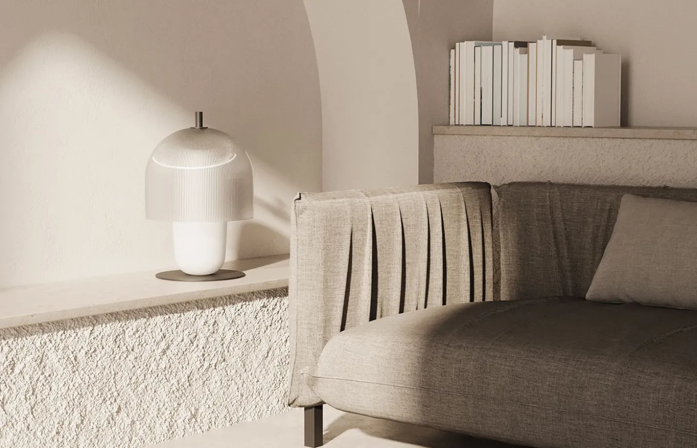 La lámpara de sobremesa Holm de Aromas del Campo es una pieza sofisticada que destaca por su diseño elegante y atemporal. Su elemento más característico es su difusor de cristal transparente estriado, que no solo aporta un toque refinado, sino que también juega con la luz para crear un efecto luminoso envolvente y cálido.