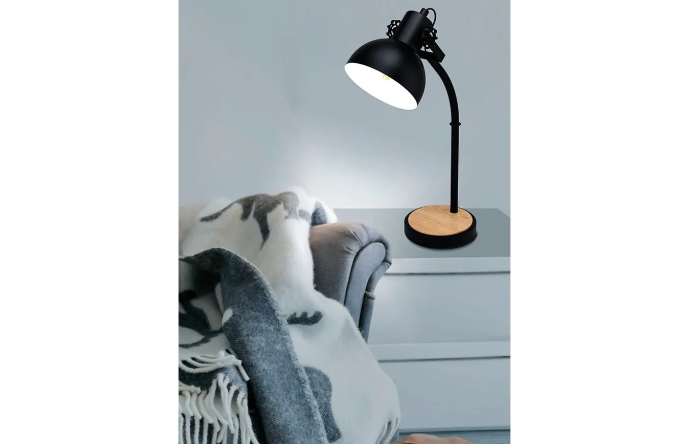 La lámpara de sobremesa Lubenham está fabricada en metal color negro y tiene un cabezal giratorio con un interior en color crema. El elemento de madera unido a la base de la lámpara asegura un carácter acogedor y completa las tendencias de decoración de estilo vintage e industrial.