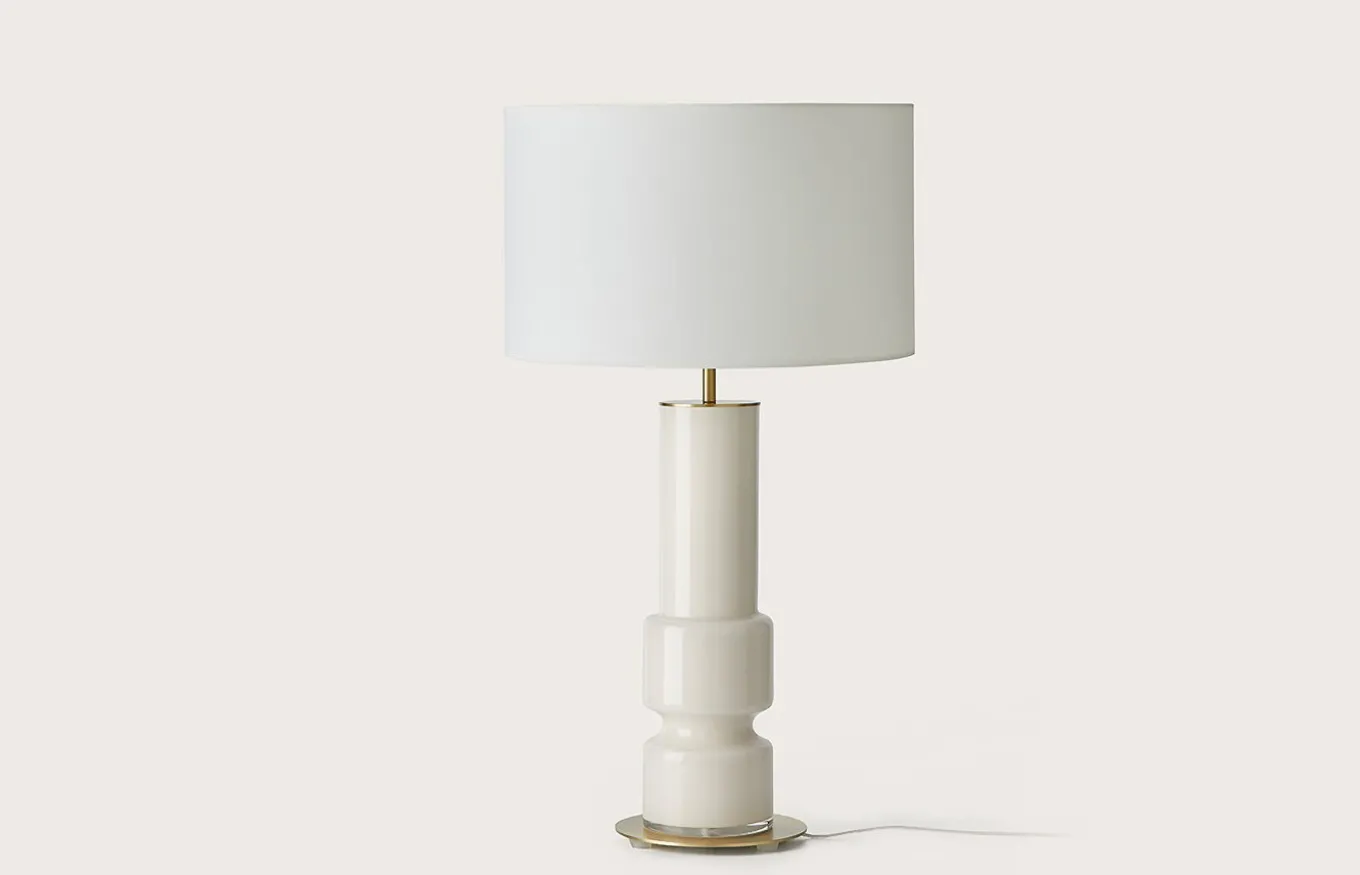 La Lámpara de sobremesa Lusa incluye una base de vidrio pintada a mano y una pantalla textil de color blanco o negro. Es perfecta para recibidores, salones, comedores o dormitorios.