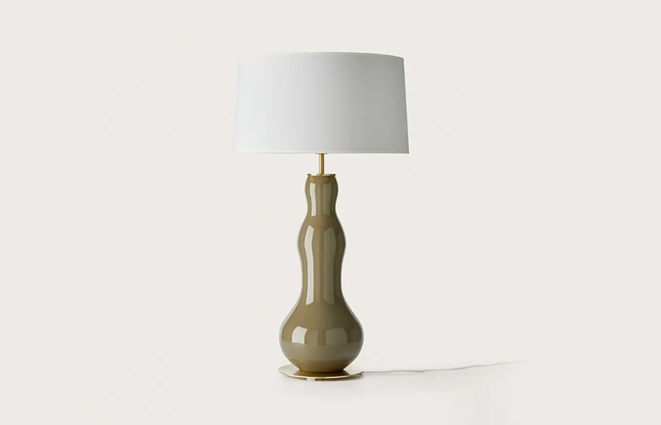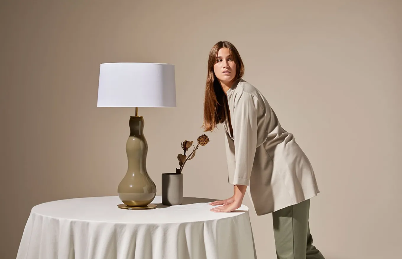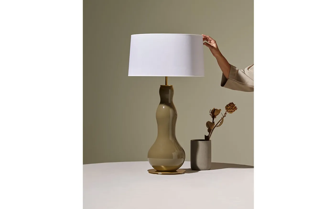 La Lámpara de sobremesa Melly incluye una base de acero y vidrio pintado a mano con una pantalla textil blanca o negra. Se trata de una luminaria con carácter para recibidores, salones o comedores.