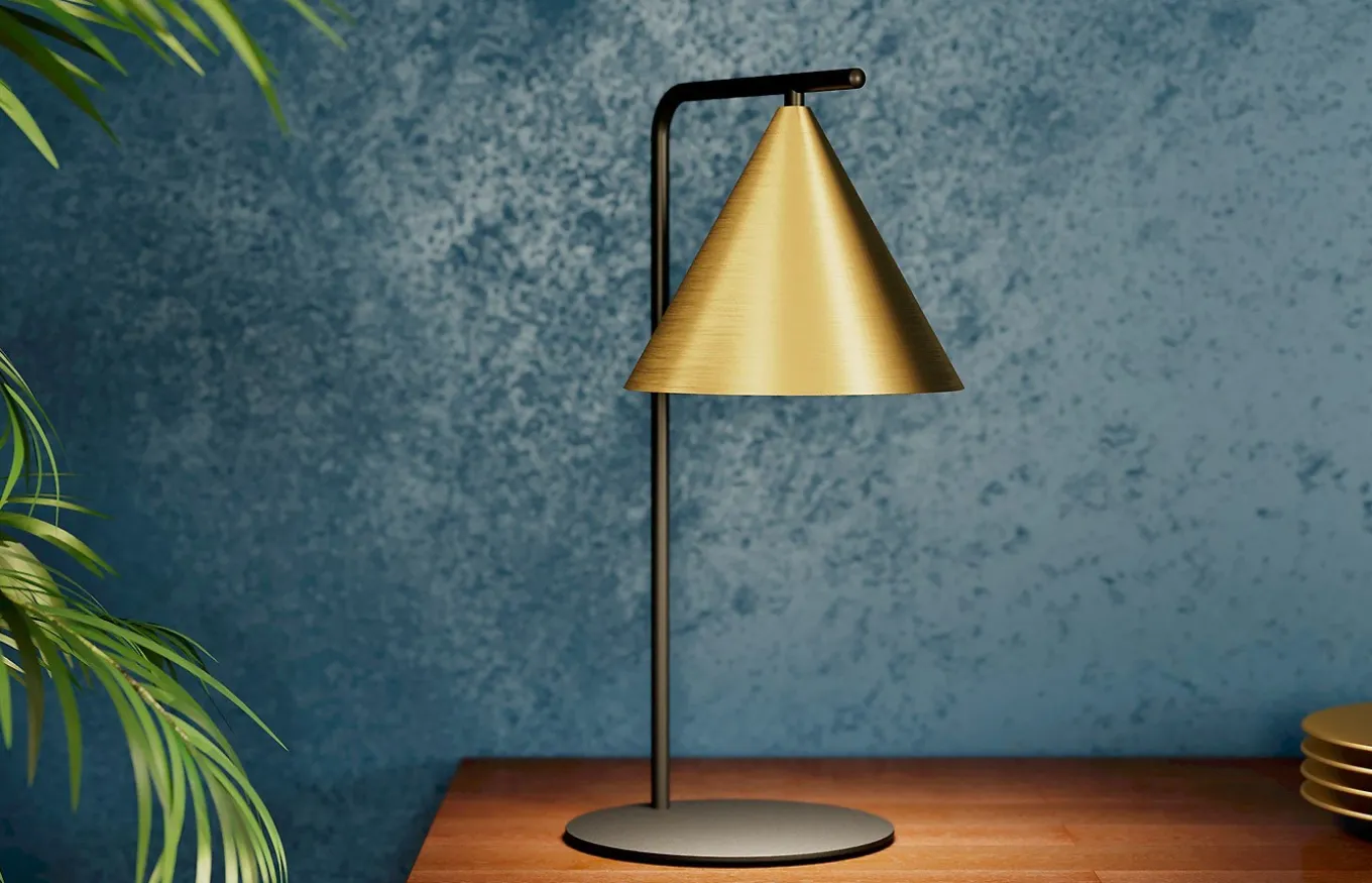 La lámpara de sobremesa Narices está formada por una base curvada de metal en color negro a la que se ha acoplado una pantalla cónica realizada en latón cepillado.