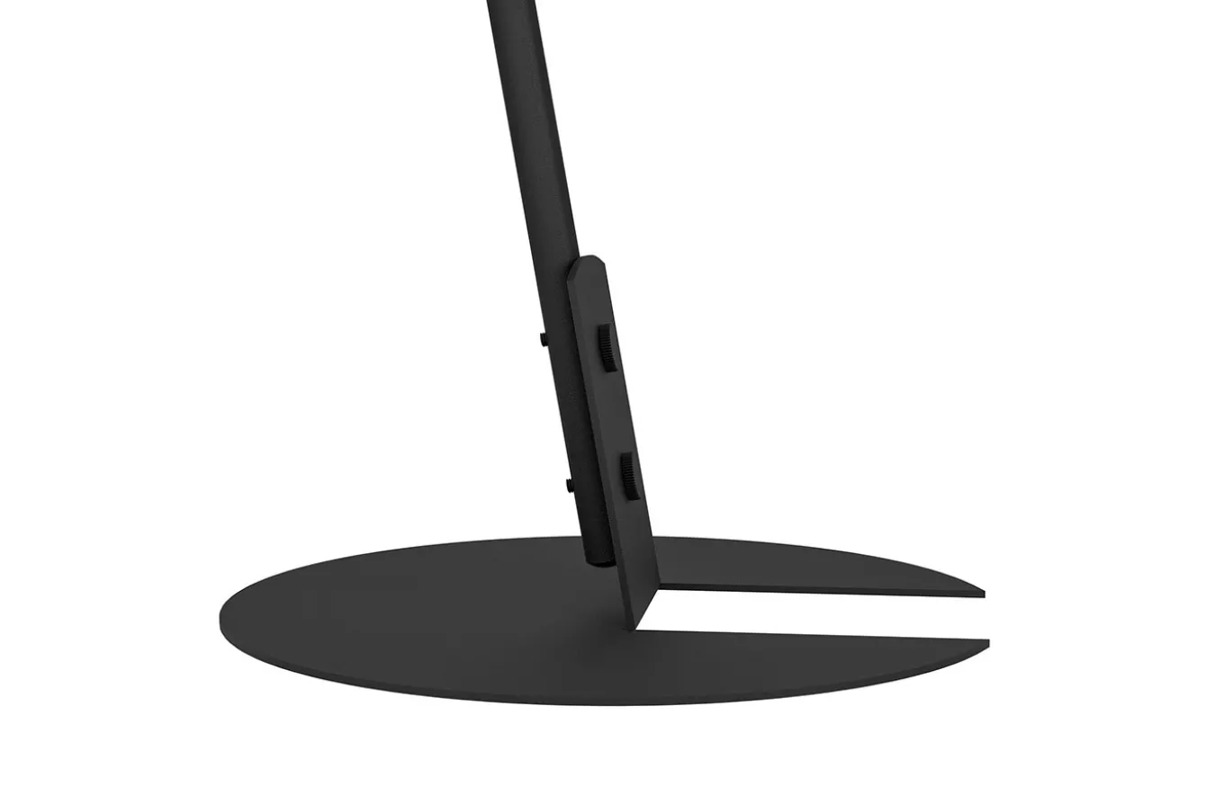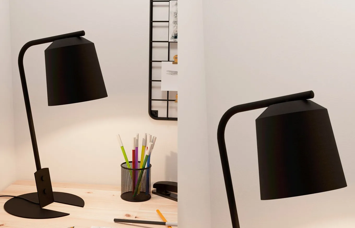 La lámpara de sobremesa Oneda está compuesta por una pantalla cónica fabricada en metal de color negro y un interior en color blanco. La base plana de metal negro, a partir de la cual se dobló hacia arriba un elemento perforado para unir el cuerpo de la lámpara, es particularmente sofisticada.