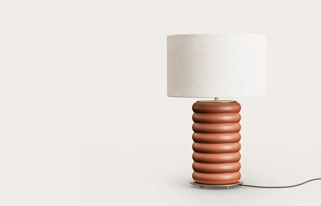 La Lámpara de sobremesa Onut tiene una base cilíndrica de cerámica pintada a mano, pantalla de tela chinz y estructura metálica. En la foto base es de color terracota con pantalla blanca y partes metálicas en oro brillo. Puedes elegir el color de la cerámica, la pantalla y el metal.