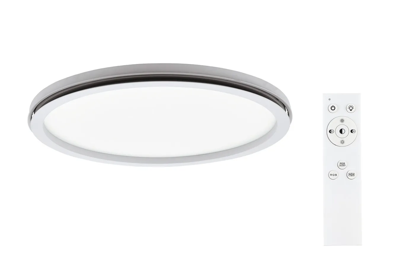 La lámpara de techo Lazaras está fabricada en metal blanco y tiene una superficie luminosa redonda de plástico en color blanco. La lámpara tiene un anillo de luz interno envolvente que emite una luz RGB indirecta en cuanto se enciende. Los LED integrados de la superficie luminosa proporcionan una luz agradable. Puede seleccionar entre luz blanca cálida, blanca neutra y blanca fría. Los elementos luminosos se pueden conectar por separado o juntos utilizando el mando a distancia incluido.