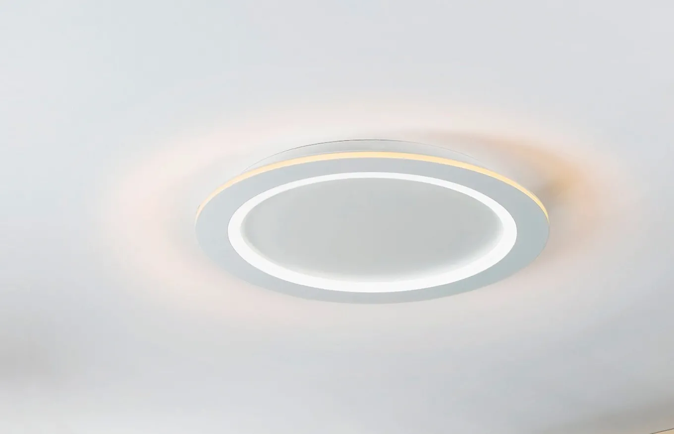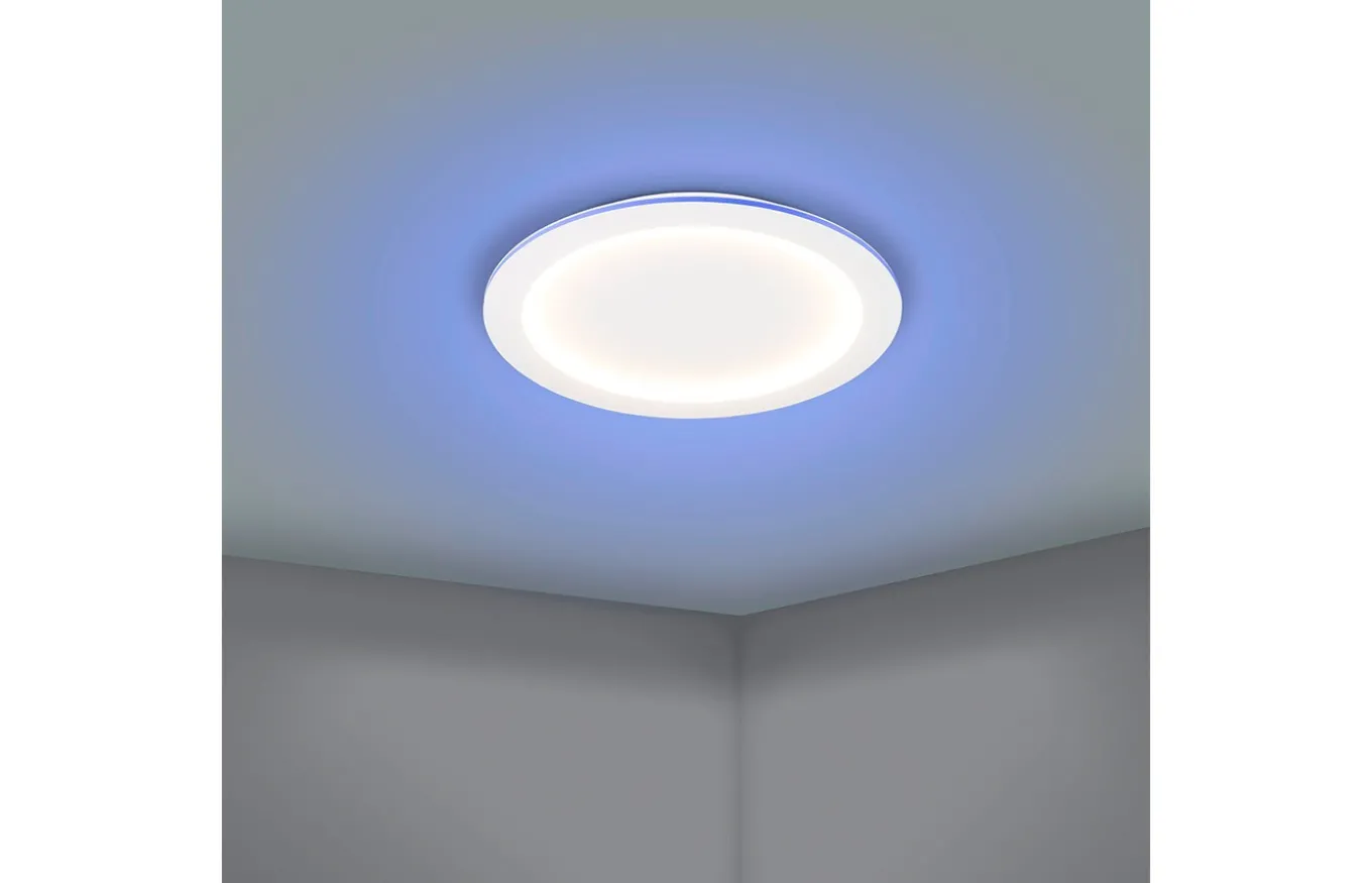 La lámpara de techo Padrogiano-Z está fabricada en metal blanco y tiene una superficie luminosa redonda de plástico en color blanco. La lámpara tiene un anillo de luz interno envolvente que emite una luz RGB en cuanto se enciende, con control remoto.