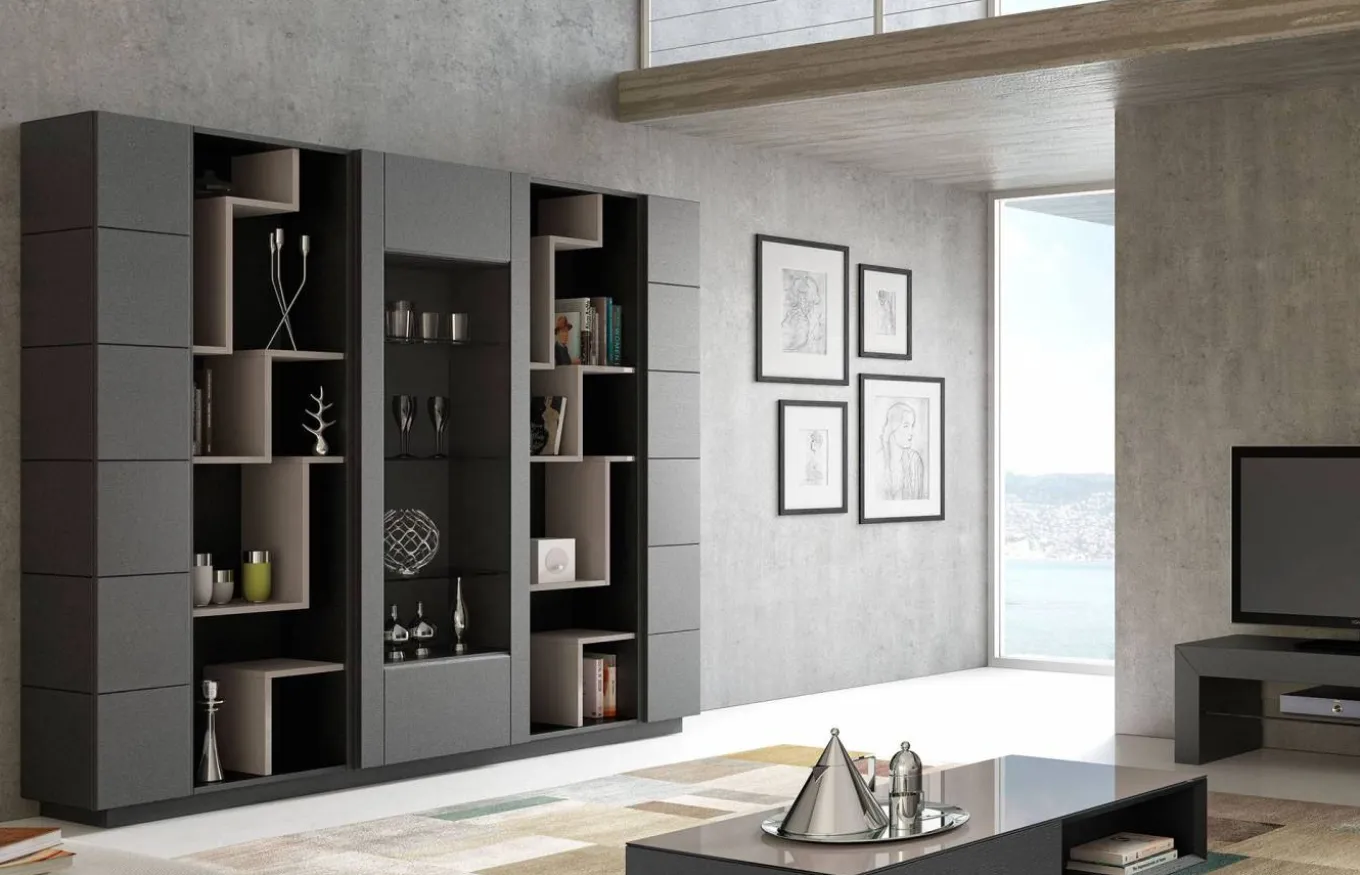 Amplia librería con vitrina en la parte central, una composición de grandes dimensiones muy polivalente que cuenta con diferentes espacios de almacenaje como vitrina, librería y puertas. Destaca el diseño singular de los estantes.
