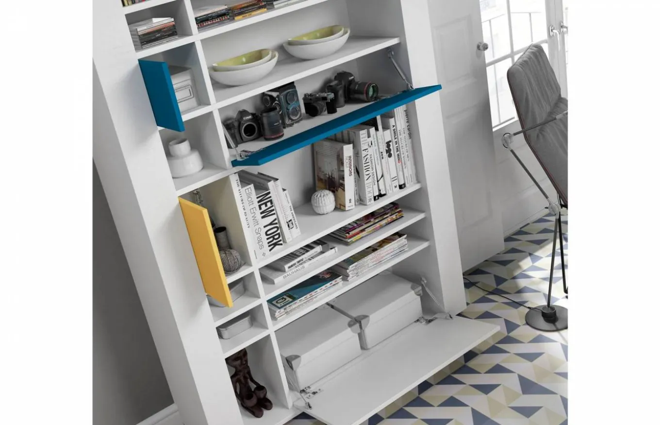 Se trata de una composición de un cuerpo con diversos estantes, pero que cuenta también con dos puertas batientes a un lado y dos puertas abatibles más grandes al otro, una pieza de lo más polivalente.