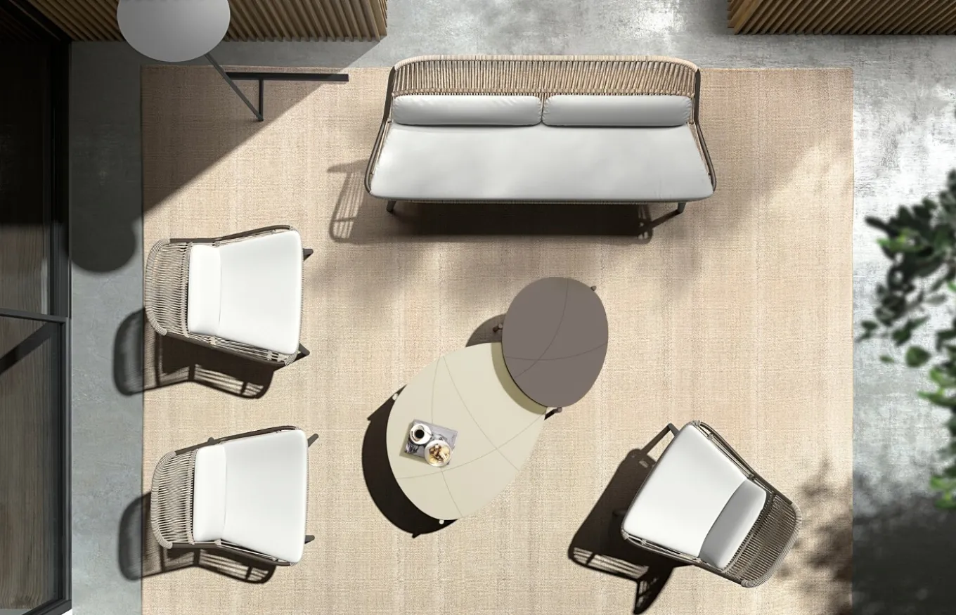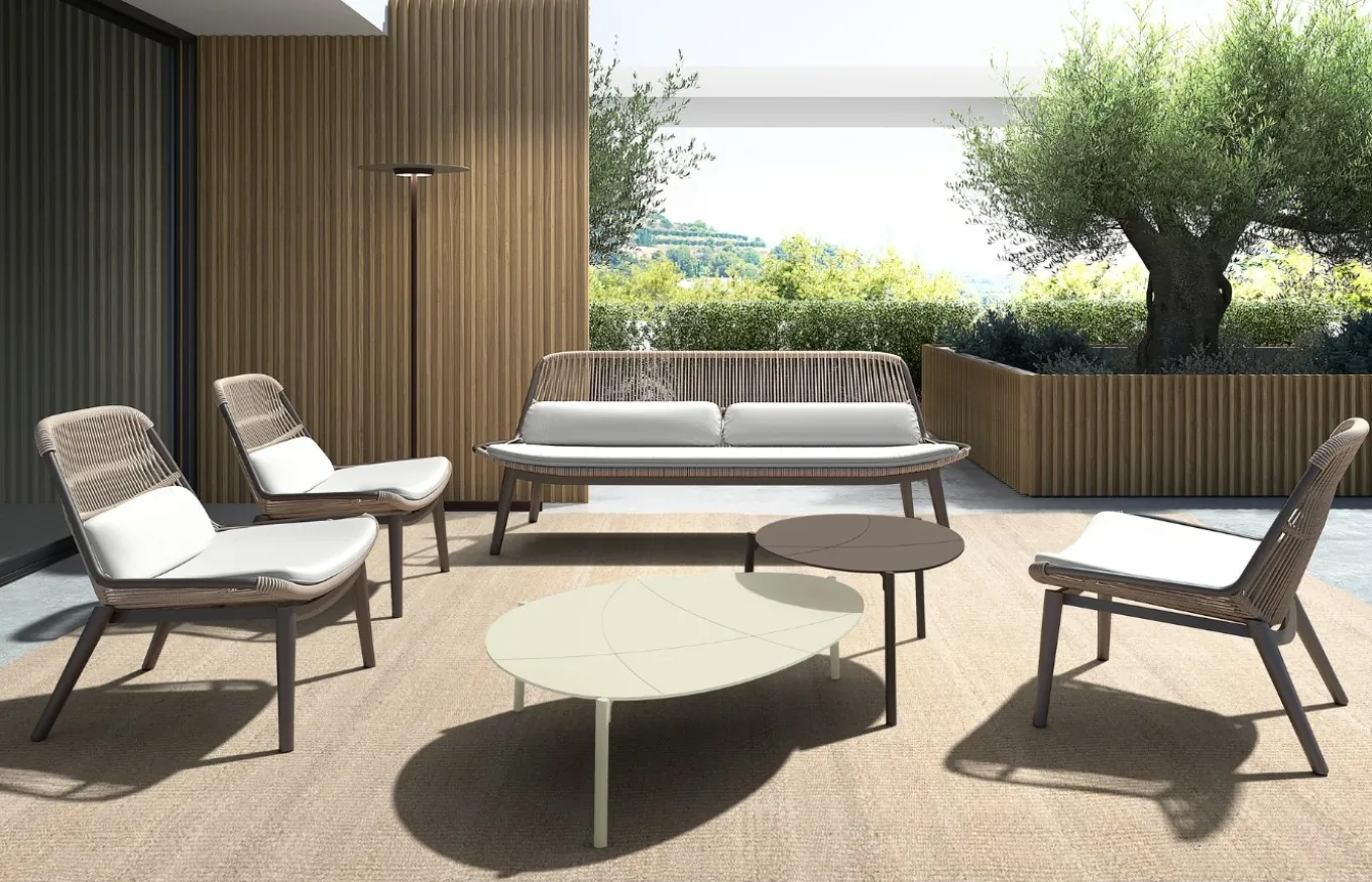 Tiene una estructura de aluminio de color marrón, en el caso de la mesa alta, y una estructura de aluminio de color ivory, en el caso de la mesa baja. Cada una de las mesas son independientes, pero se combinan a la perfección de manera conjunta en tu espacio al aire libre.