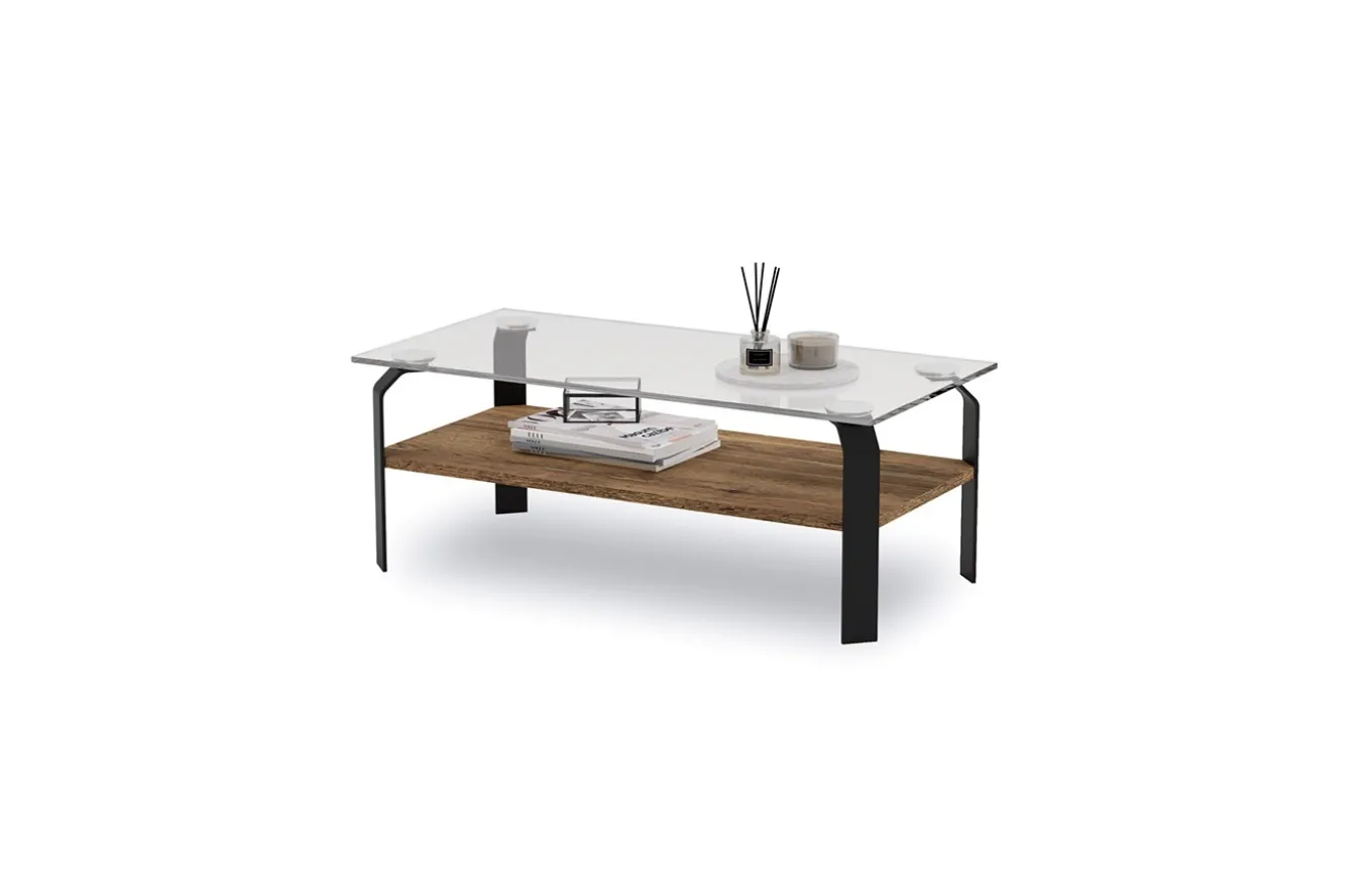 La mesa de centro F destaca por su tapa en acabado cristal templado transparente combinada con patas metálicas y con una balda en acabado madera.