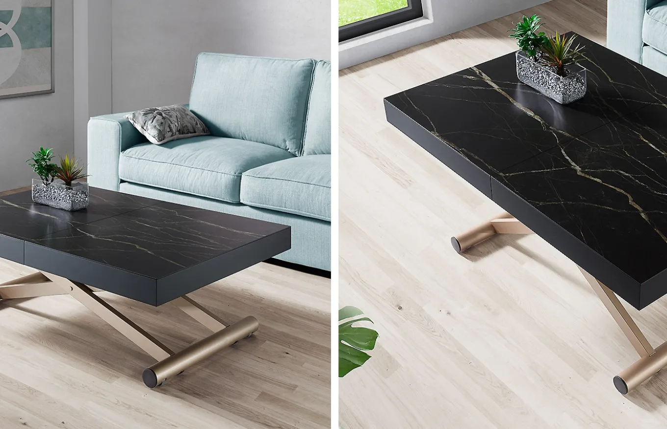 La mesa de centro transformable Melisa se convierte en mesa una de comedor, mediante un sistema de elevación manual. Una opción maravillosa para salones con espacio reducido ofreciendo la oportunidad de tener dos mesas en una, como mesa de centro y como mesa de comedor.