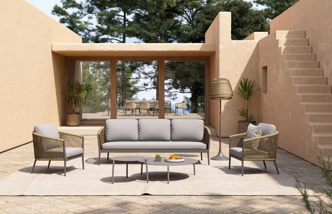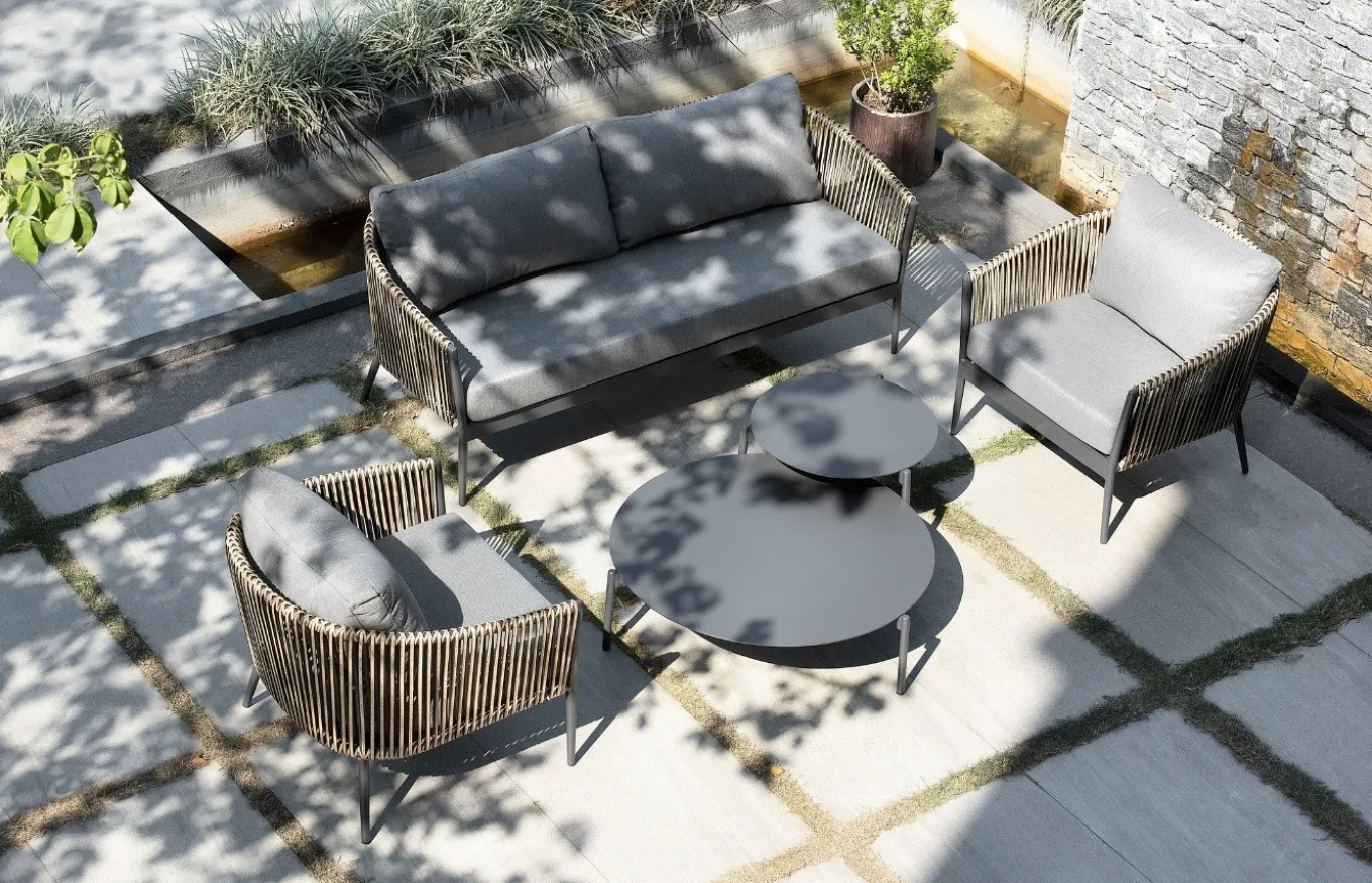 La mesa de centro Tropea de Agua de Mar tiene un diseño moderno, ideal para complementar espacios exteriores e interiores. Gracias a su estructura de aluminio en color gris antracita, hace que esta mesa de centro sea altamente resistente a la intemperie.