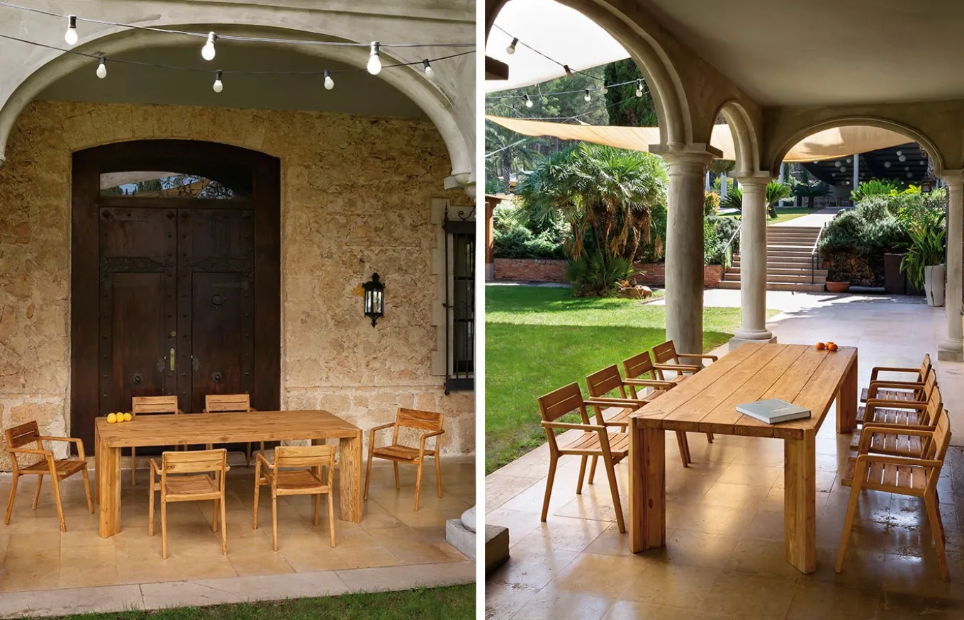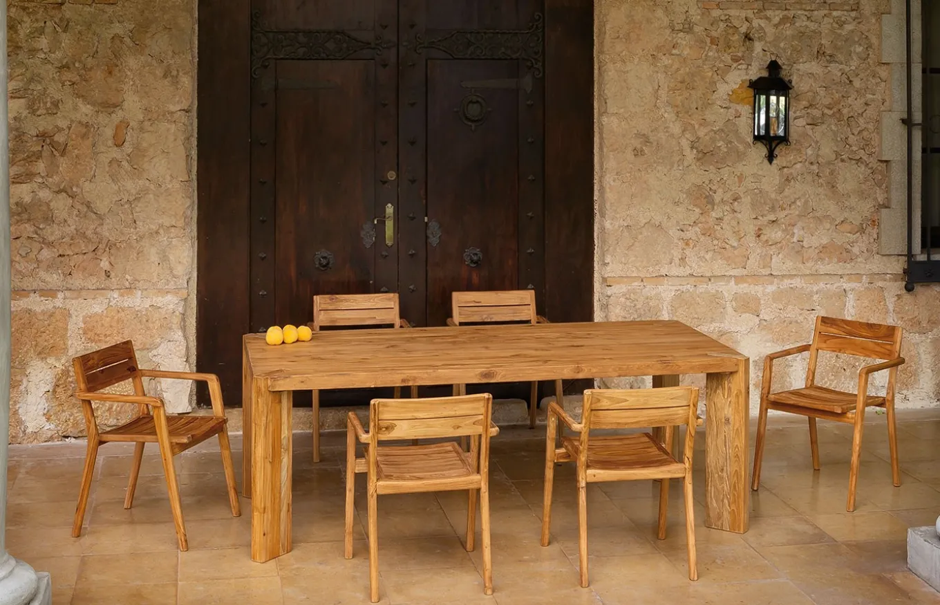La mesa de comedor de exterior Eco aporta una elegancia natural y cálida al espacio exterior. Destaca por las líneas nobles que ofrece su fabricación en madera de Teca reciclada, un material sostenible que aporta durabilidad.