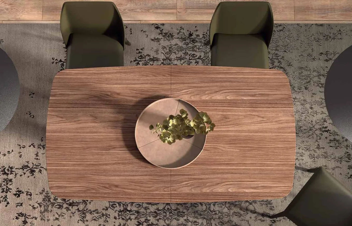 La mesa de comedor extensible es sencilla y elegante. Destaca por su delgada tapa de canto de 1 cm más chaflán mdf negro. Cuenta con un extensible con volteador y sistema de apertura sincronizado.