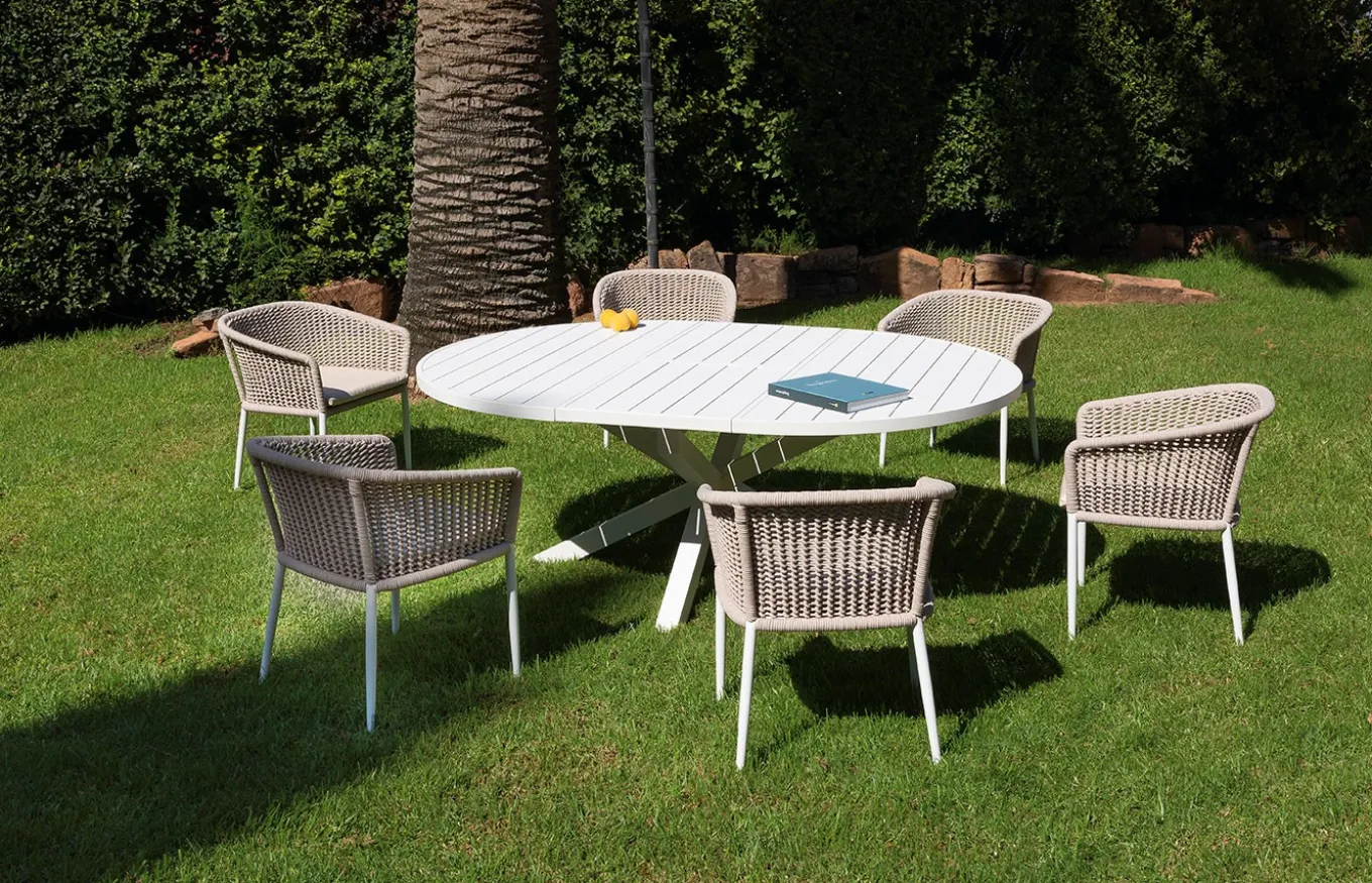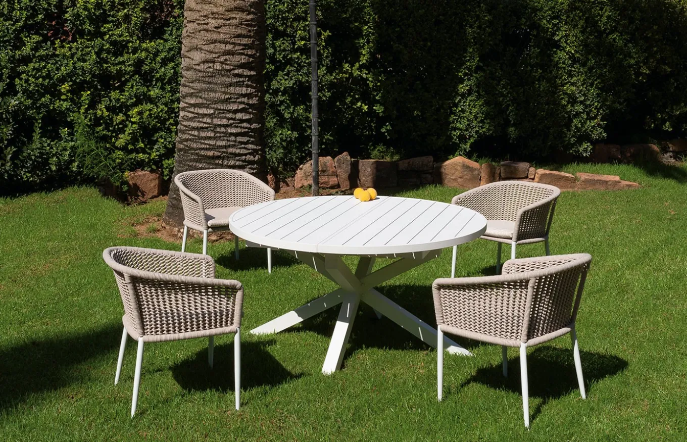 La mesa de comedor redonda extensible de exterior Nerja es un clásico que no pasa de moda. Su tapa es de aluminio, lo cual la convierte en una mesa tenaz y firme.