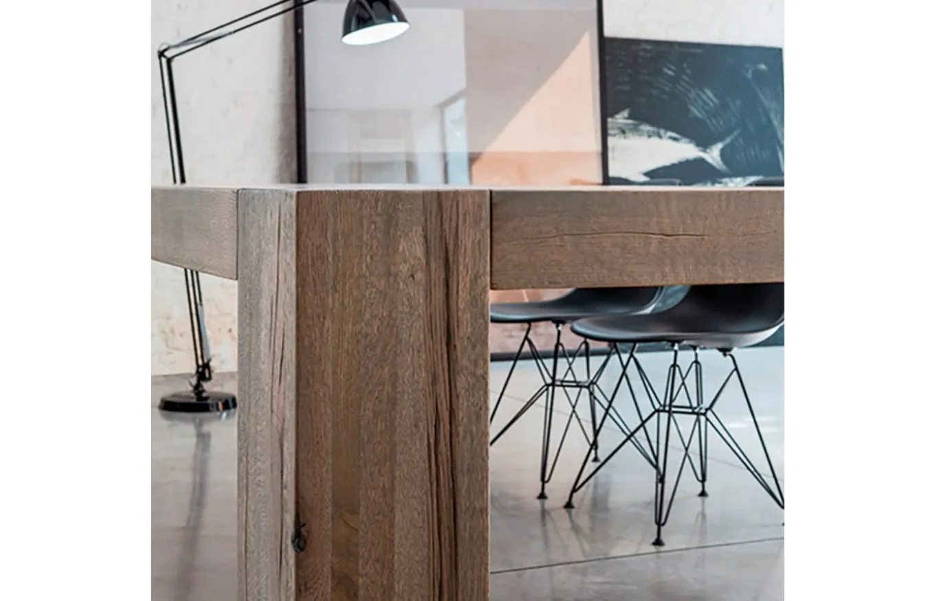 - Robustas patas de 20×20 cm fabricadas también en roble matérico.