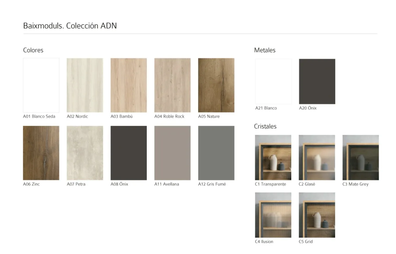 La colección ADN de Baixmoduls te ofrece una gran variedad de muebles donde la estética y la funcionalidad van de la mano. Soluciones de almacenamiento para el salón, que podrás personalizar con los diferentes acabados y medidas para adaptarlo a tus necesidades.