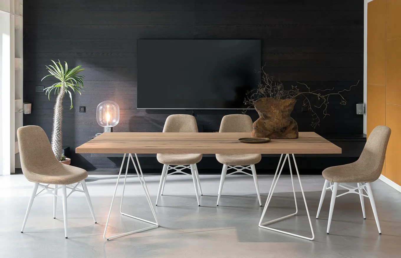 La Mesa de comedor Filo combina la ligereza estética con una gran solidez. El diseño de Rivanova es muy funcional, fácil de interpretar, pero al mismo tiempo rico en detalles dados por los materiales utilizados: madera natural, cristal y hierro. Rivanova selecciona la madera por su singularidad, realzada por imperfecciones naturales que son consideradas parte integrante del resultado final que se quiere conseguir.