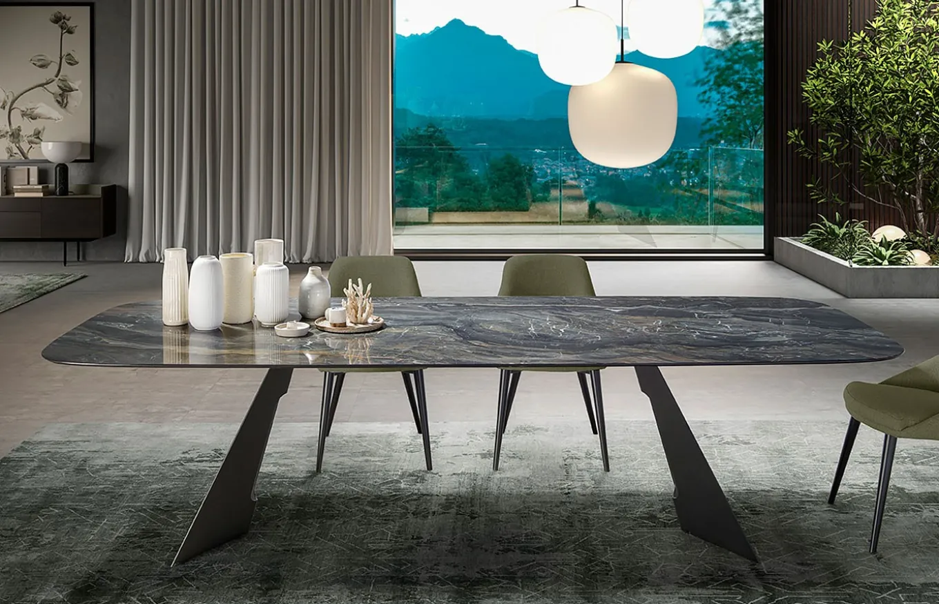 La mesa de comedor Kiv Keramic es una mesa de líneas puras y sencillas que, gracias al diseño, los materiales y los acabados, ilumina el salón. Su fabricación fusiona unas patas metálicas y un elegante tablero porcelánico de 12 mm de grosor.