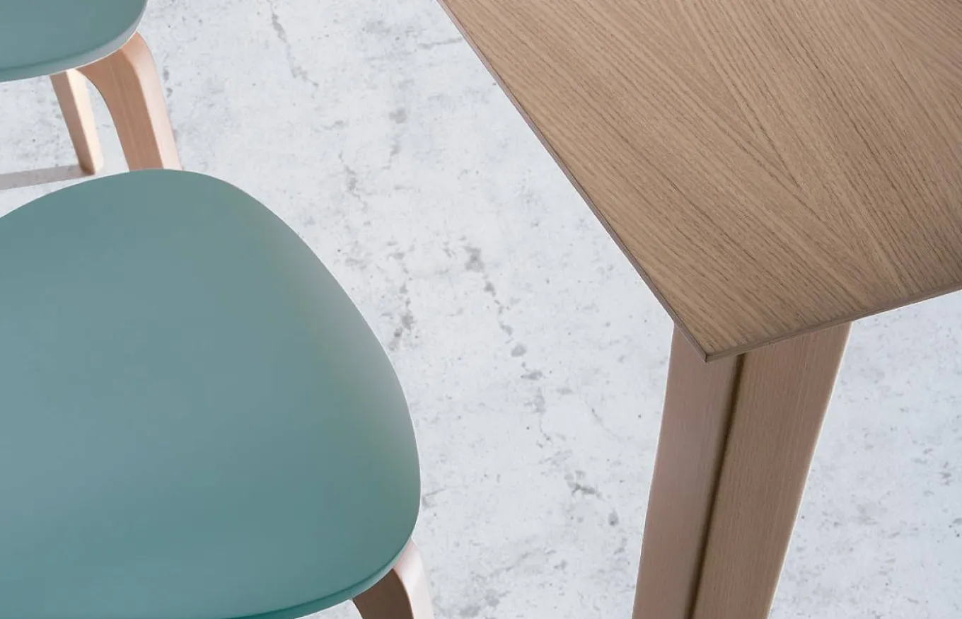 Mesa de comedor fija de estilo nórdico, con unas distintivas y personales patas, y tapa lisa con parte inferior biselada. Disponible opción de tapa de madera o porcelánica.