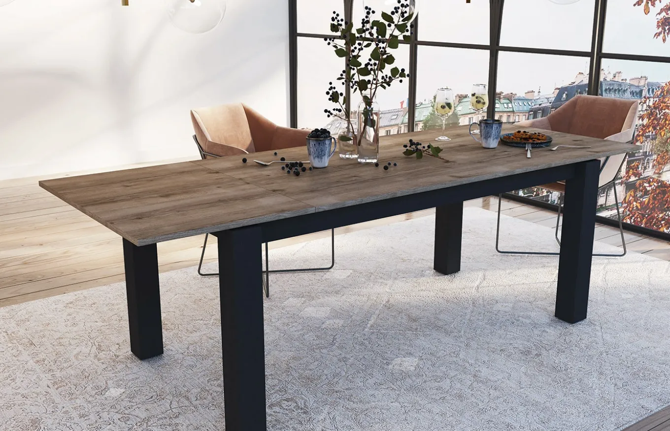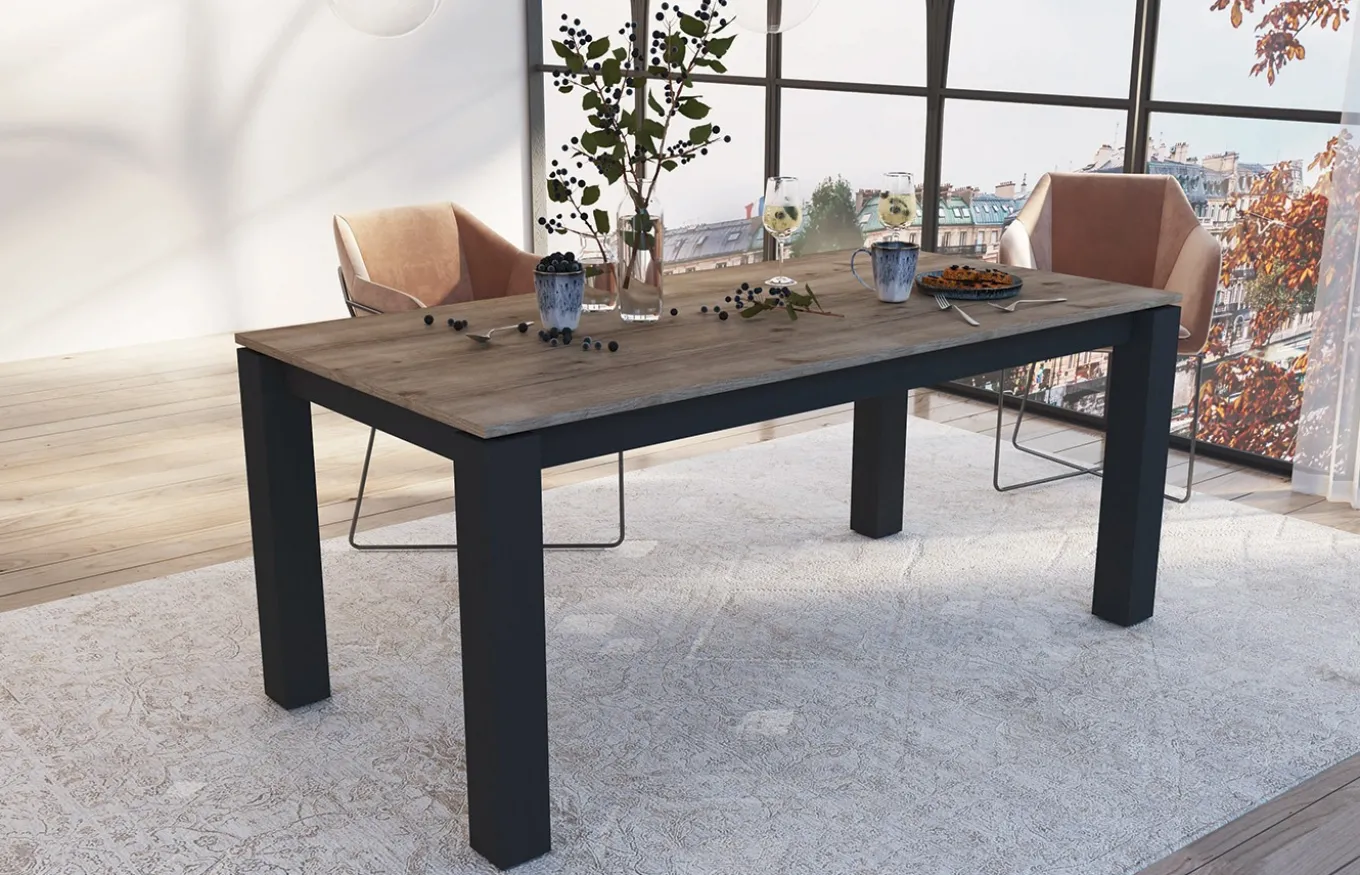 Mesa de comedor extensible con un diseño neutro y minimalista capaz de encajar en estancias de varios estilos, lo que hace de ella una mesa muy polivalente. El sistema de apertura es mediante el deslizamiento de la tapa (ver fotos).