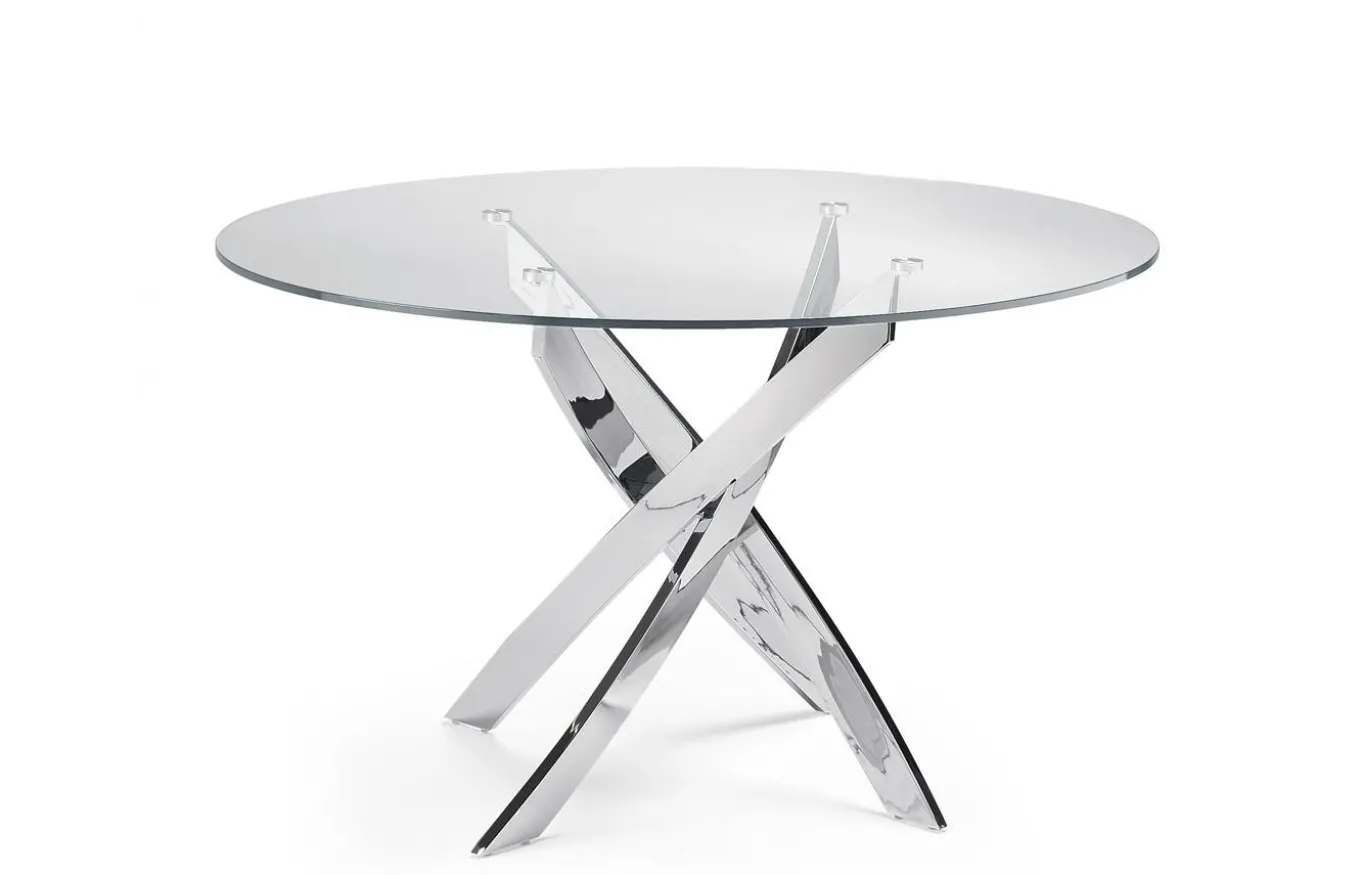 Sencilla y elegante mesa de comedor de estilo moderno con tapa de cristal templado y base de acero inoxidable cromado.