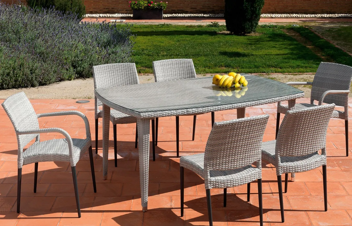 La colección Mónaco de Arkimueble destaca por su estructura de fibra sintética, resistente a los rayos UV y a la intemperie.
