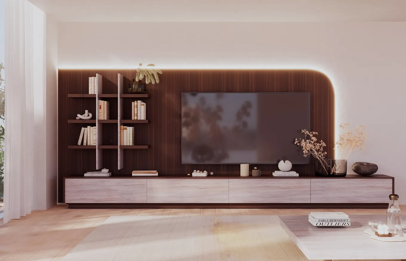 La nueva propuesta de composición de salón Qubic de Piñero y Cabrero presenta un diseño moderno, se trata de una colección innovadora y totalmente personalizable ya que ofrece muebles a medida que se adaptan perfectamente a cualquier espacio. Esta composición combina una trasera de madera con esquinas redondeadas e iluminación LED perimetral, baldas colgantes y un mueble TV de cuatro cuerpos.