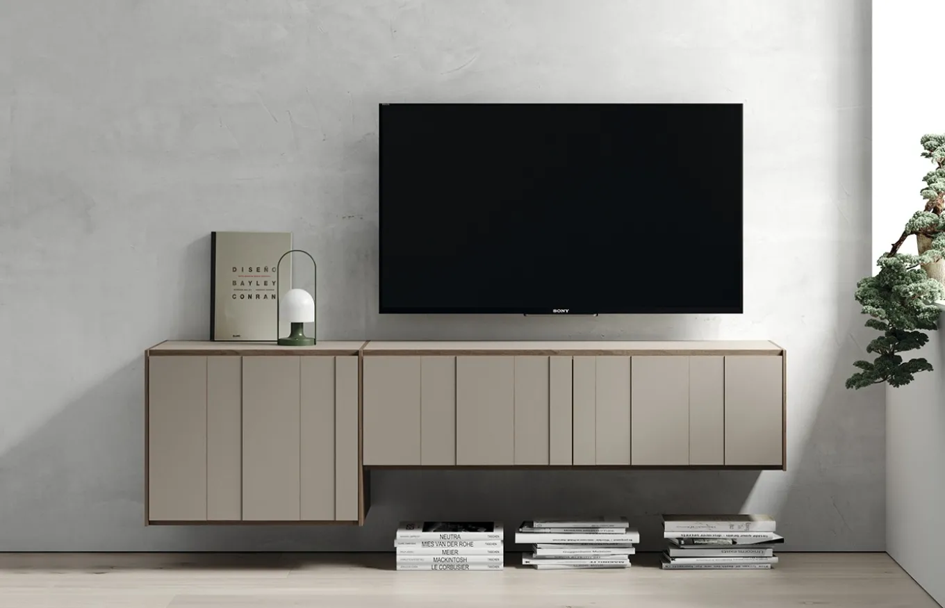 El mueble de televisión suspendido de Lagrama: Diseño atemporal y funcionalidad en estado puro para el corazón de tu hogar. Este mueble, de líneas depuradas y minimalista, se adapta a cualquier estilo decorativo y aporta un toque de sofisticación a tu salón.