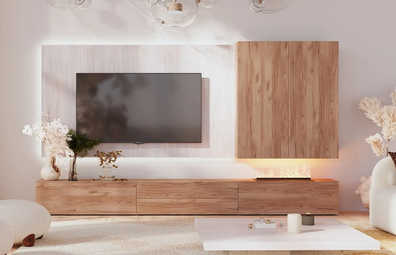 Esta composición combina un panel colgado laminado en color Tazacorte enmarcado con una iluminación LED perimetral. El mueble de televisión, con una tapa de de 1.9 cm de grosor, está compuesto por 2 trampones de apertura push y un módulo con dos cajones extraíbles con apertura push. Incluye una chimenea eléctrica mediante vapor seco y luz LED.