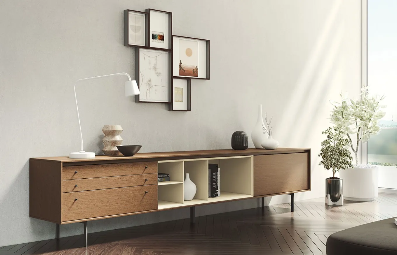 Mueble tv de estilo moderno. La colección Kross se desarrolla en torno a una gran variedad de módulos con distintas medidas, puertas batientes, abatibles, cajones y una multitud de opciones con diversidad de materiales y acabados. Una manera diferente de entender el mueble, pensado no solo para ordenar, sino para el placer de crear y diseñar tu propio mueble.