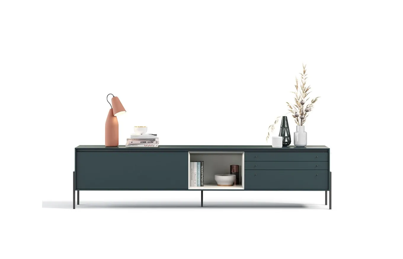 Mueble tv de estilo moderno. La colección Kross se desarrolla en torno a una gran variedad de módulos con distintas medidas, puertas batientes, abatibles, cajones y una multitud de opciones con diversidad de materiales y acabados. Una manera diferente de entender el mueble, pensado no solo para ordenar, sino para el placer de crear y diseñar tu propio mueble.