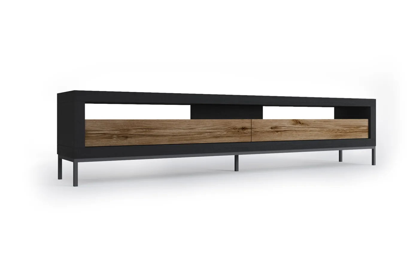 El acabado del modelo de la foto es: Estructura del mueble TV en laminado Madera Negra con frentes en chapa de madera Roble Vintage y patas en laca color Grafito.
