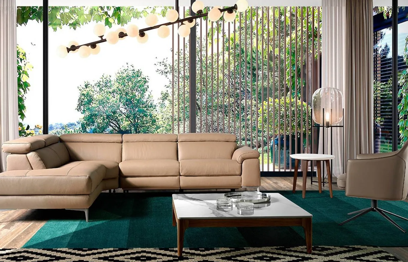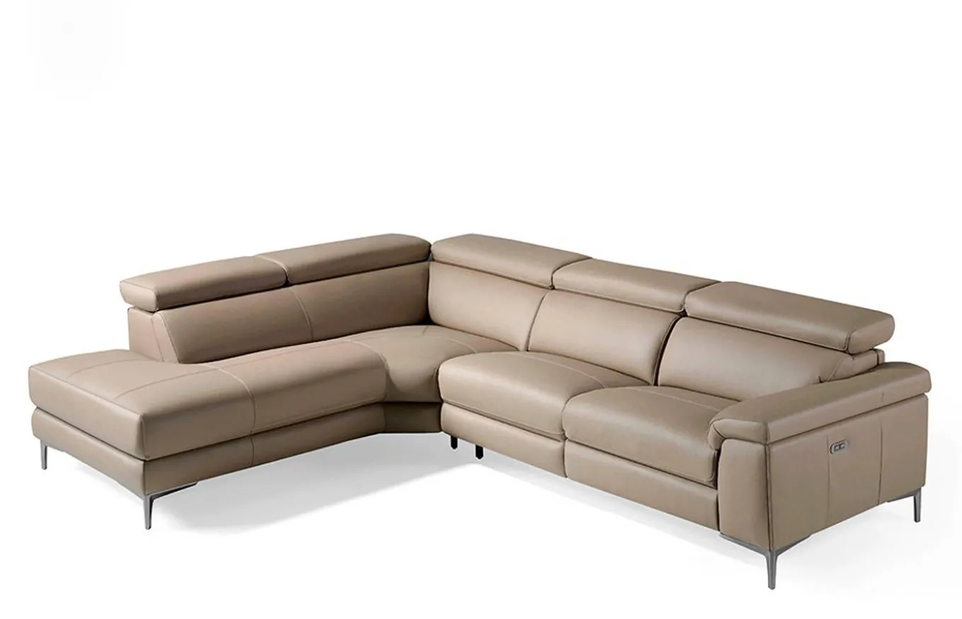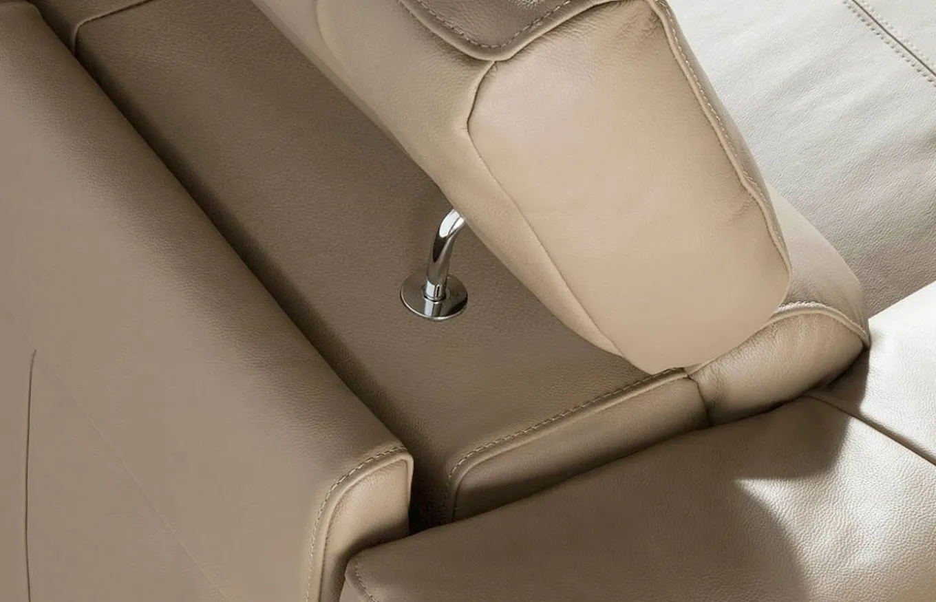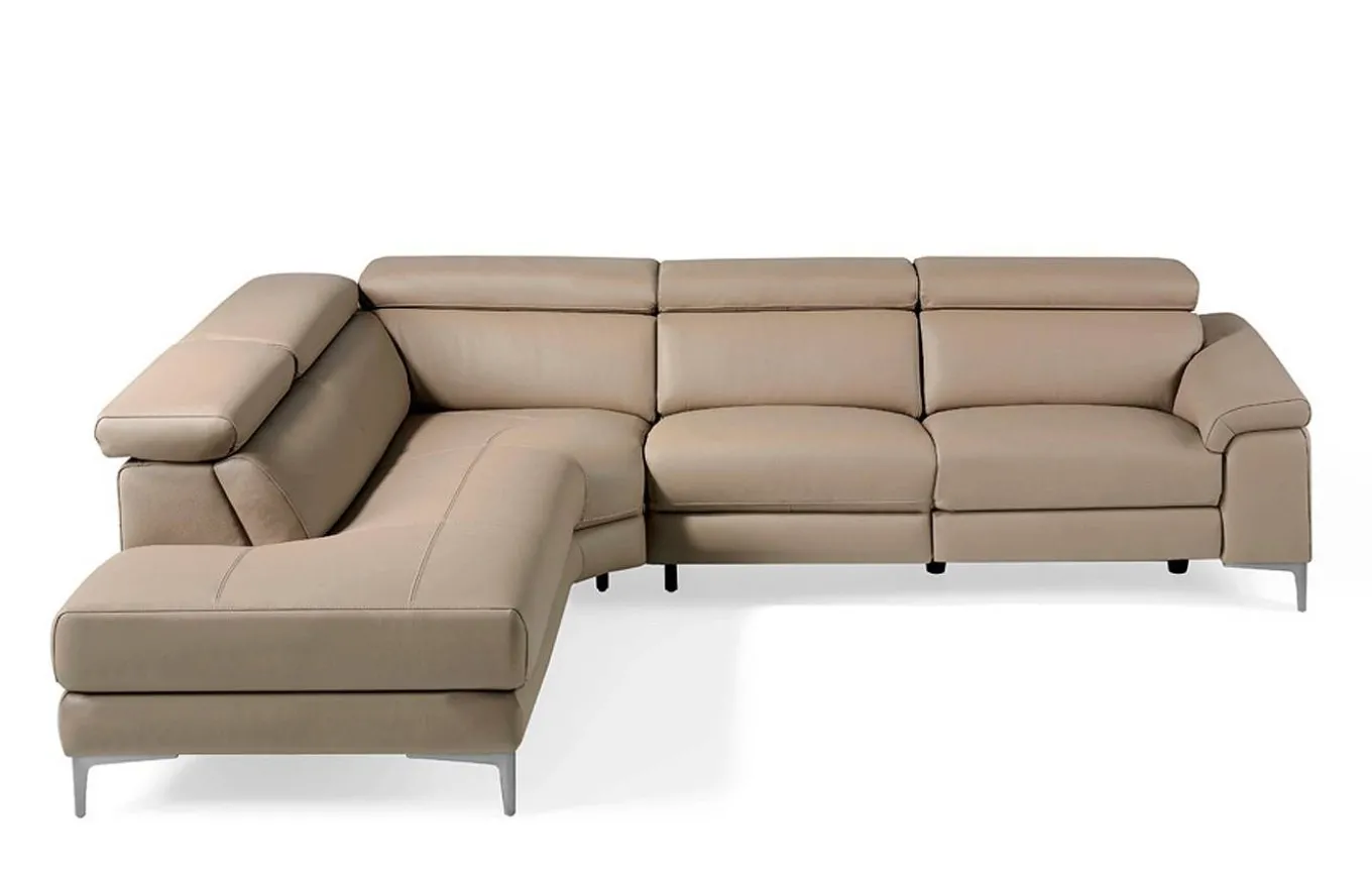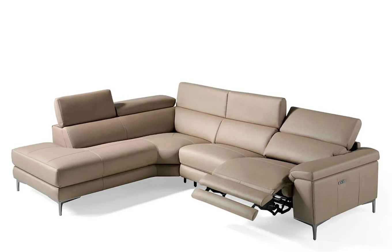 Rinconera de estilo moderno con asiento relax eléctrico, tapizado en piel de color visón y patas de acero.