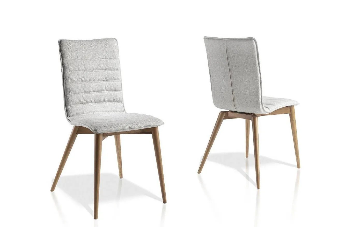 Silla de comedor distinguida silla de estilo moderno con un diseño depurado y muy actual. Lleva asiento y respaldo tapizados de una sola pieza en tela color Beige con patas en nogal.