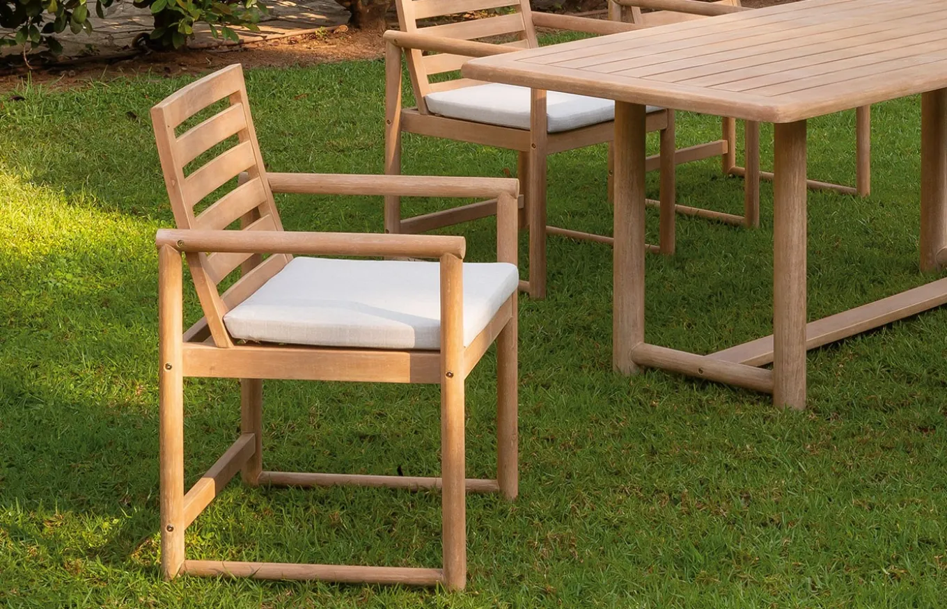La silla de exterior Green es cómodo y confortable gracias a su cojín mullido. Diseño que combina una estructura de madera de ecualipto con un tapizado de tonalidad suave apto para exterior.