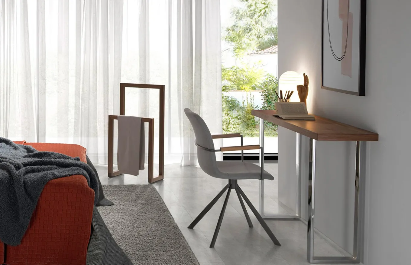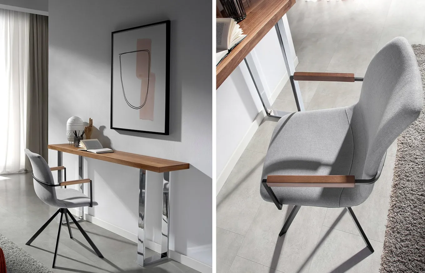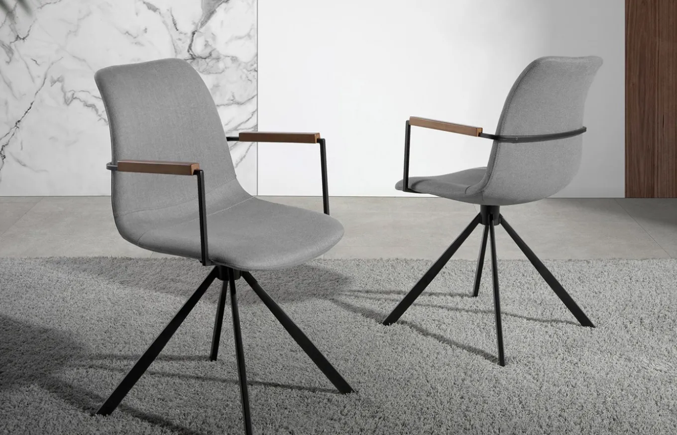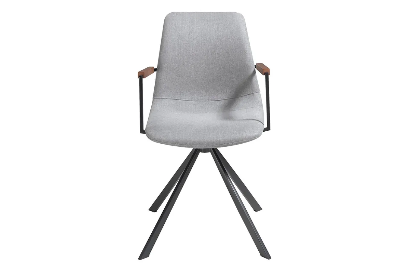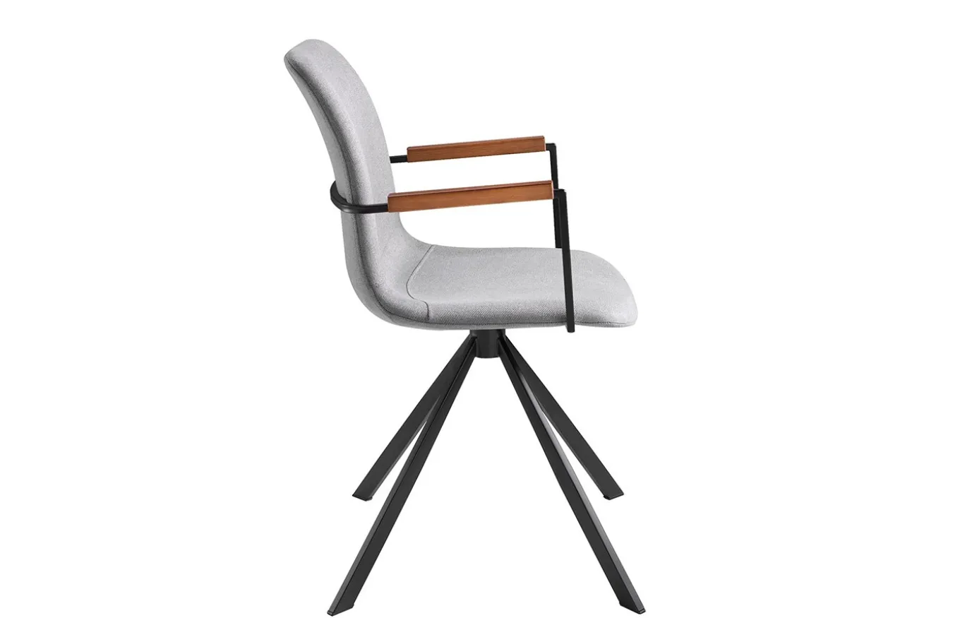 Silla giratoria de diseño moderno tapizada en tela color gris. Una silla de tendencia y estilo atemporal con patas de acero tintado en epoxi color negro que se convertirá en el must have de tu comedor. Su asiento de espuma de poliuretano de 25kg/m3 y diseño envolvente le aportará ese estilo único y personal al espacio, a la vez que le otorgará la mayor comodidad.