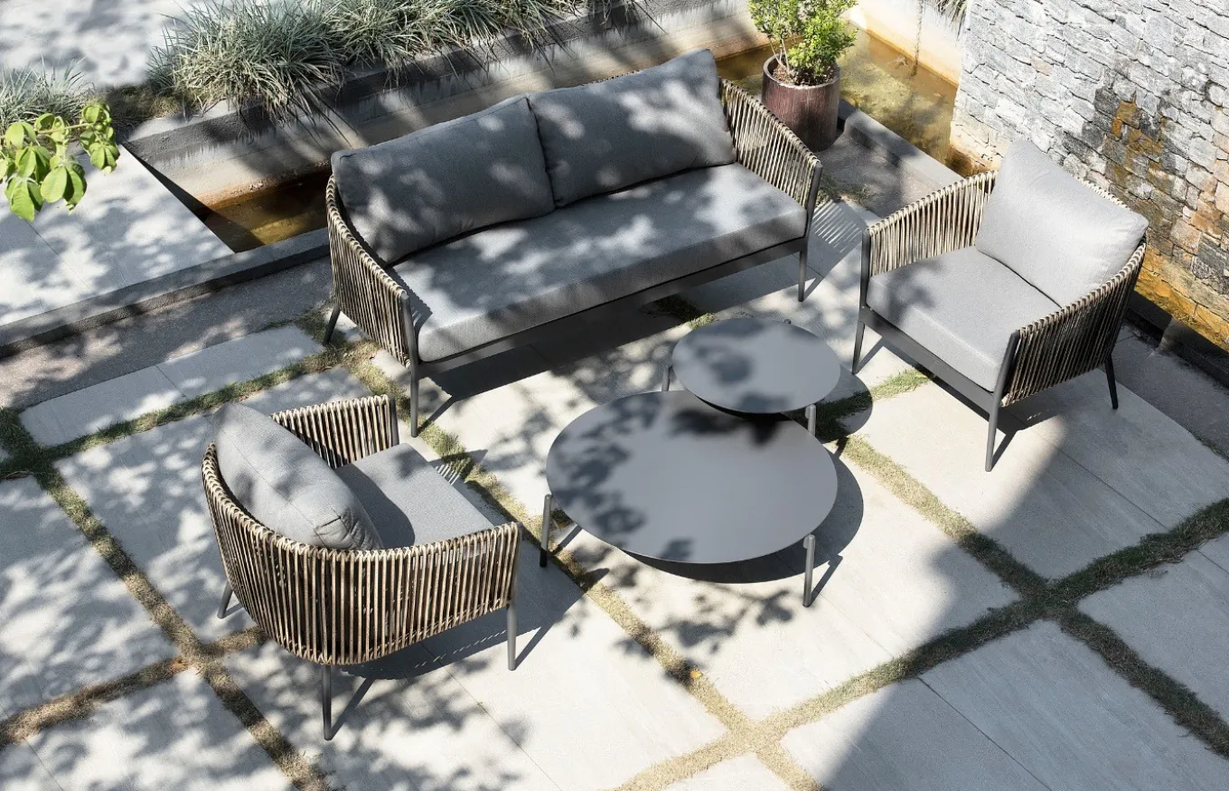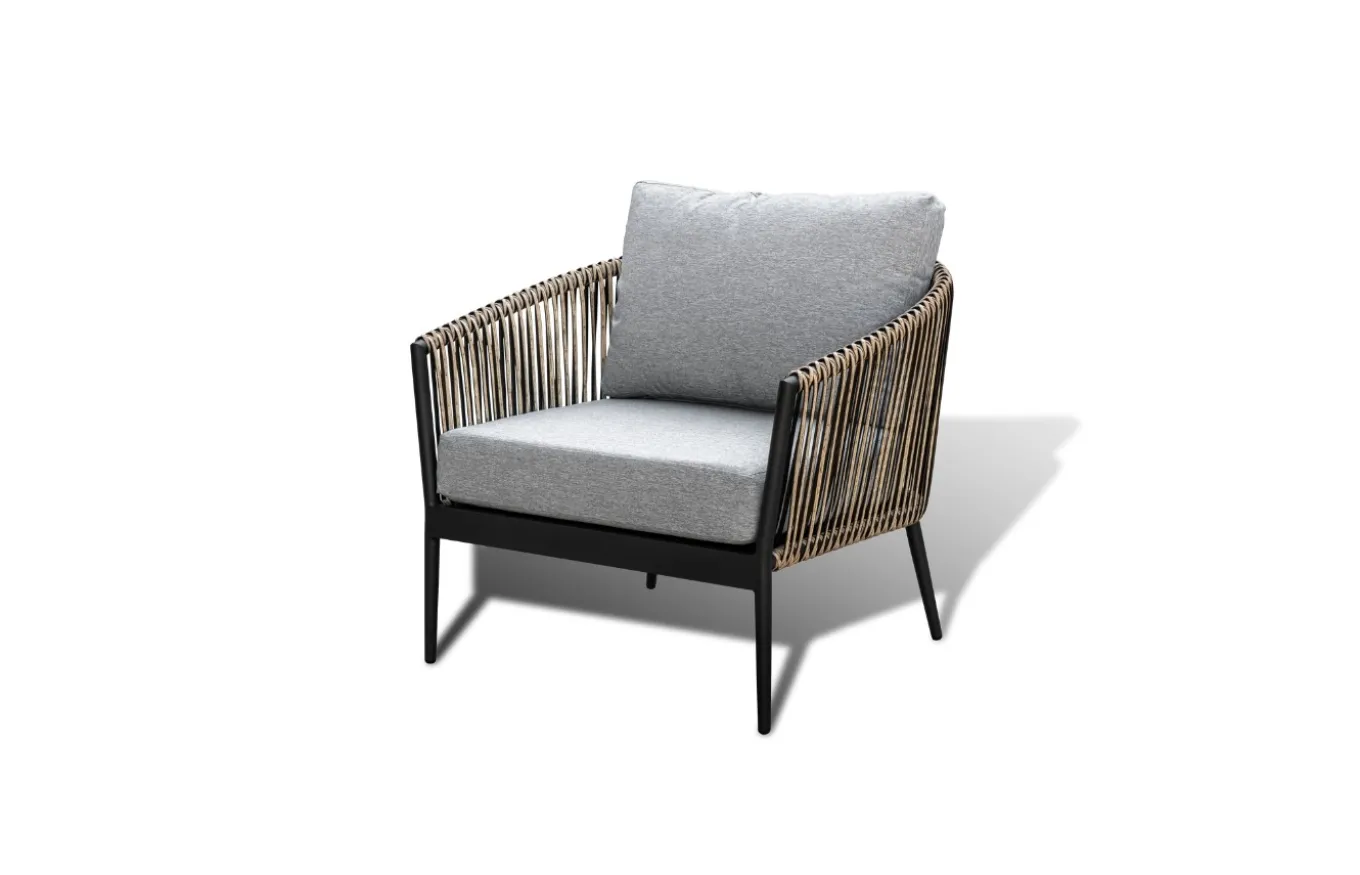 Tiene una estructura de aluminio en color carbón que proporciona resistencia y un respaldo y reposabrazos trenzados con fibra sintética de color natural, aportando calidez. Además, los cojines garantizan una increíble comodidad y pueden tapizarse en una gran variedad de acabados.