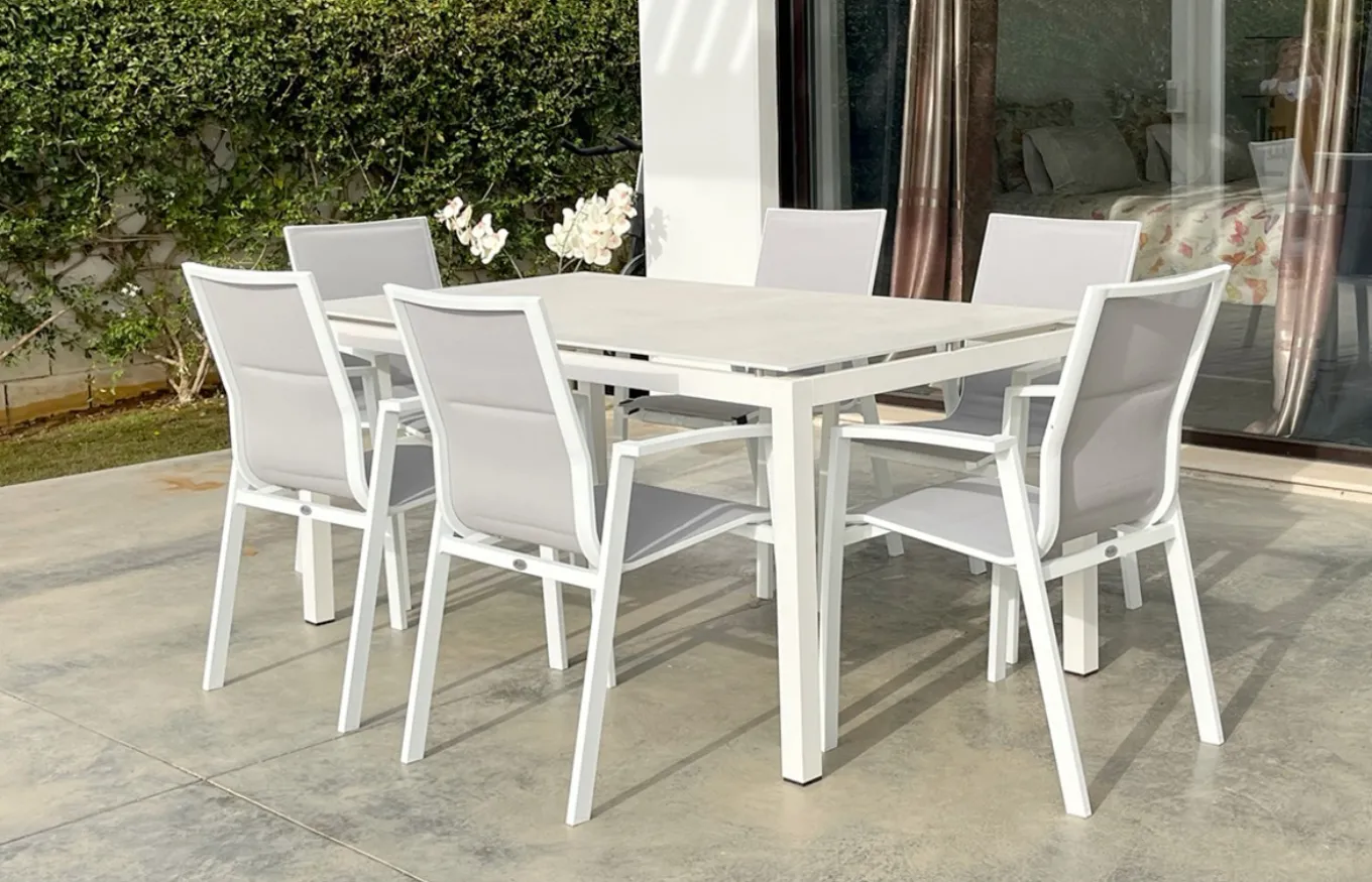 Completa tu comedor exterior con la colección Madrid. Este sillón de comedor combina a la perfección con la , creando un conjunto sofisticado y funcional para disfrutar al aire libre.