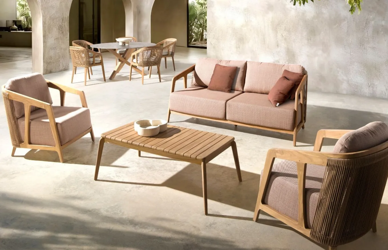 La colección de exterior Río de Joenfa ofrece muebles cálidos y rústicos, perfectos para jardines y terrazas, fabricados con materiales de alta calidad. La colección está diseñada para resistir el clima y brindar comodidad. Joenfa es una empresa española especializada en mobiliario de interior y exterior, destacando por su uso de materiales naturales y sostenibles como la teca reciclada y fibras artesanales.