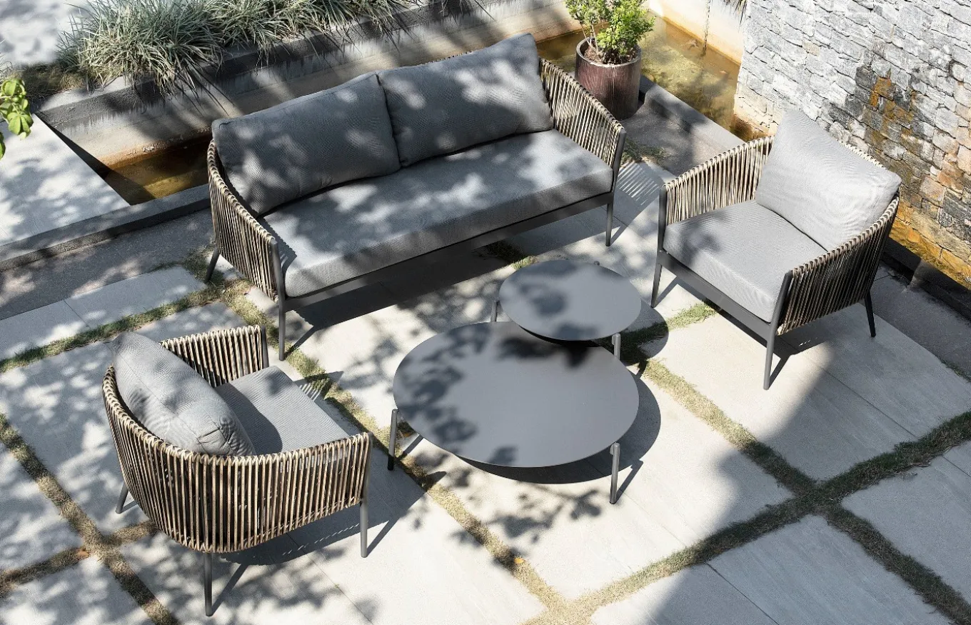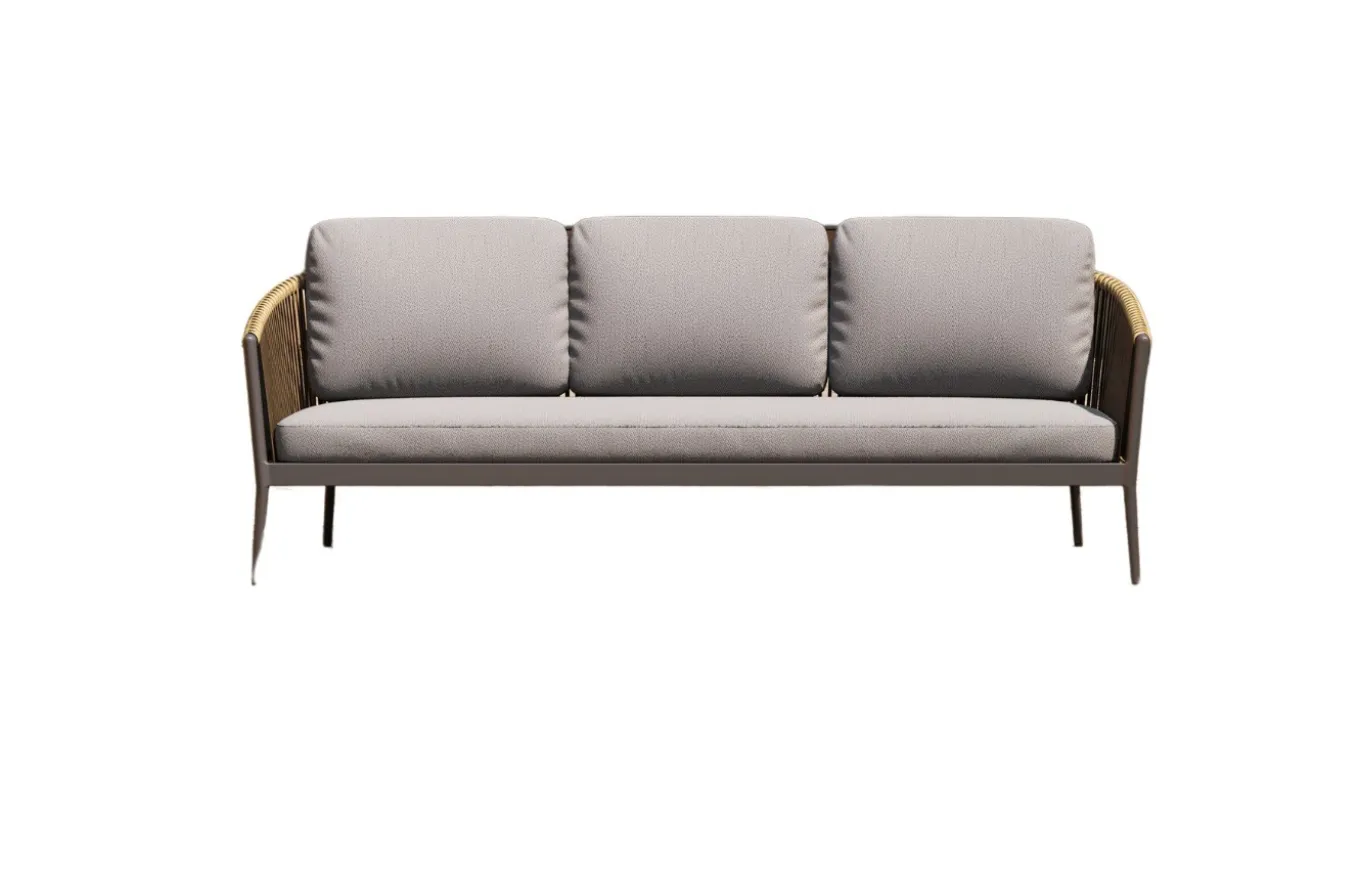 Tiene una estructura de aluminio en color carbón que proporciona resistencia y un respaldo y reposabrazos trenzados con fibra sintética de color natural, aportando calidez. Además, los cojines garantizan una increíble comodidad y pueden tapizarse en una gran variedad de acabados.