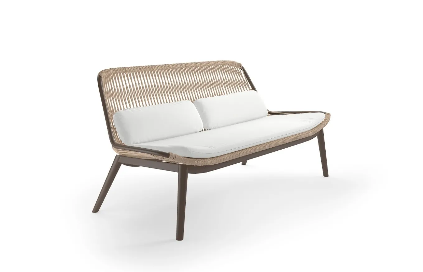 Tiene una estructura de aluminio de color marrón y un asiento y respaldo de cuerda natural que ofrece un diseño artesanal y una estética cálida. Además, incluye cojines tapizados en una gran variedad de acabados para garantizar comodidad y que se adapten a cualquier espacio.