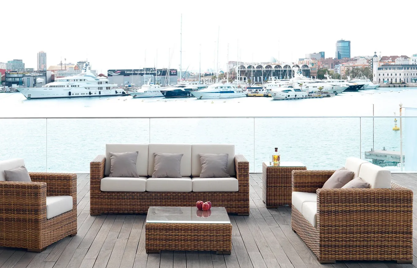 Sofá de exterior Dakar de Rattan. Todas las colecciones de Rattan están fabricadas con la fibra sintética Solana. Inspirada en la naturaleza y perfeccionada técnicamente hasta alcanzar el máximo nivel de confort, funcionalidad y durabilidad. Tiene calidez y apariencia natural, tacto agradable, variedad de texturas y trenzados, es de fácil limpieza y mayor ligereza.